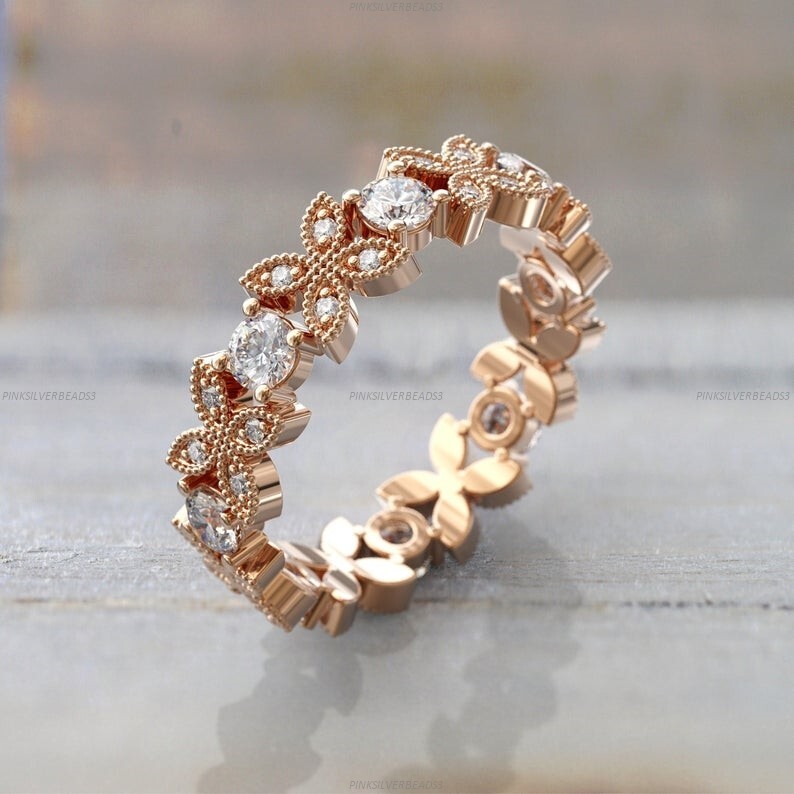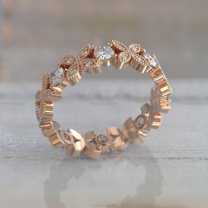 Number of Gemstones: As Seen in Picture Material: Diamond Sizable: Yes Brand: Handmade Personalize: No Style: Band Main Stone Shape: Round Occasion: Anniversary, Birthday, Christmas, Engagement, Graduation, Christening, Confirmation/Communion, Mother\'s Day, Valentine\'s Day Base Metal: Rose Gold Main Stone Creation: Natural Features: Engraved, Nickel-Free, Stackable, Handcrafted Metal: Rose Gold Ring Size: 7 Seller Warranty: Yes Country of Origin: India Secondary Stone: No Stone Setting Style: As Seen in Picture Handmade: Yes Gemstone Clarity Grade: Eye Clean Type: Ring Theme: Beauty, Bohemian, Ethnic, Healing, Love, Luck, Special Occasion, Halo, Love & Hearts Color: Pink Shape: Wedding Signed: Yes Country/Region of Manufacture: India Band Width: 2.4 Main Stone: Moissanite Cut Grade: Excellent Main Stone Color: White Metal Purity: 14k