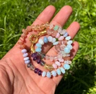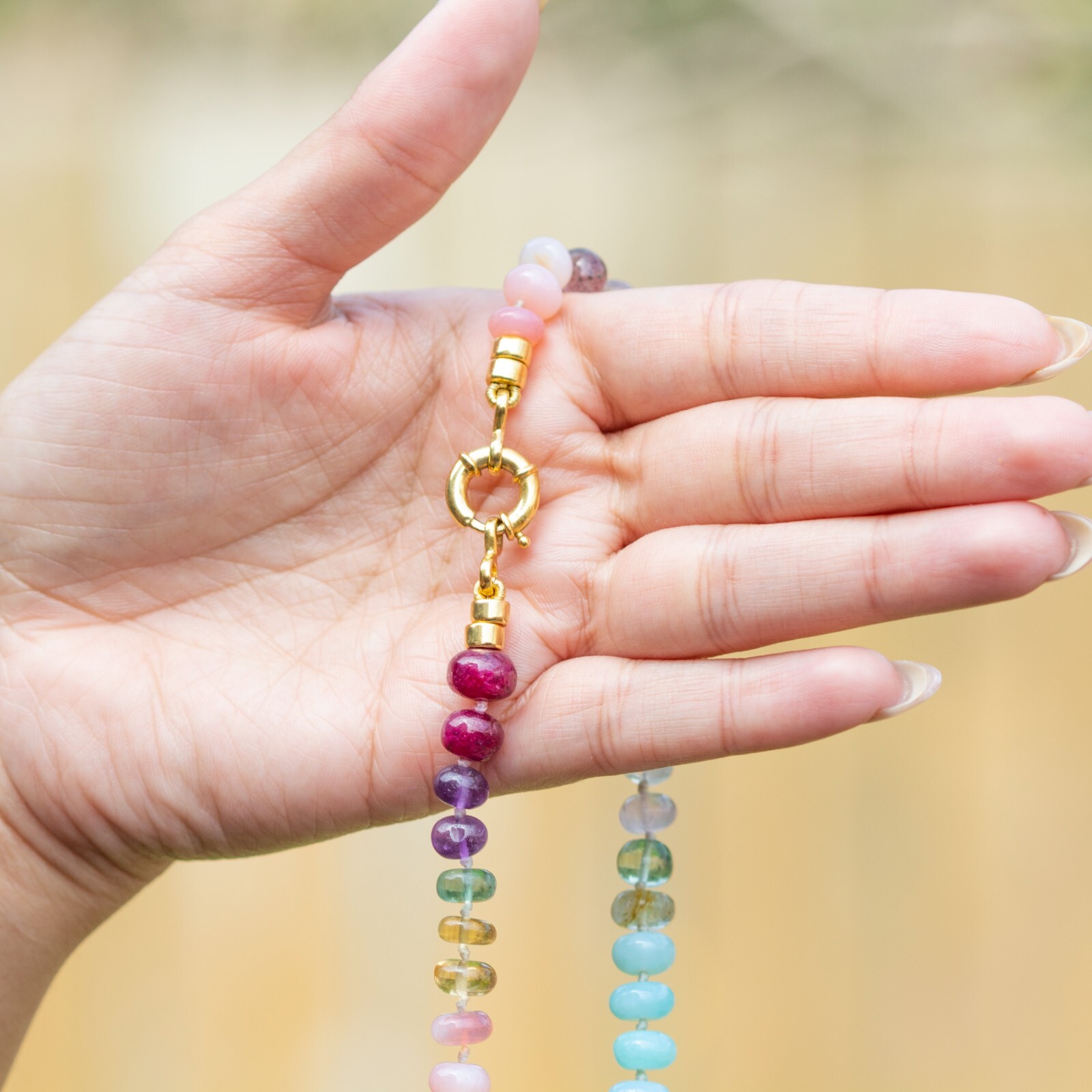 Multi-Gemstone Beaded Necklace—Hand-Knotted Silk Thread | 18” | 925 Sterling Silver Gold Vermeil Clasp Item Number: SAG1076 Add a sophisticated burst of color to your jewelry collection with this handcrafted multi-gemstone beaded necklace , featuring a vibrant medley of premium natural stones. Each 7–8mm bead is individually selected for its beauty and energetic properties, then meticulously hand-knotted on luxurious silk thread to ensure durability, fluidity, and timeless elegance. Key Features: Gemstones: Quartz, Peruvian Opal, Amethyst, Moonstone, Rose Quartz, Larimar, Fluorite, Sunstone, Citrine Bead Size: 7mm to 8mm Thread: High-quality hand-knotted silk for an elegant drape Clasp: Classic Sailor Clasp Metal: 925 Sterling Silver with 18k Gold Vermeil Finish Length: 18 inches (standard collarbone length) Finish: Polished and professionally strung by hand This versatile necklace adds a refined touch to both casual and formal outfits and makes a thoughtful gift for gemstone lovers and collectors.