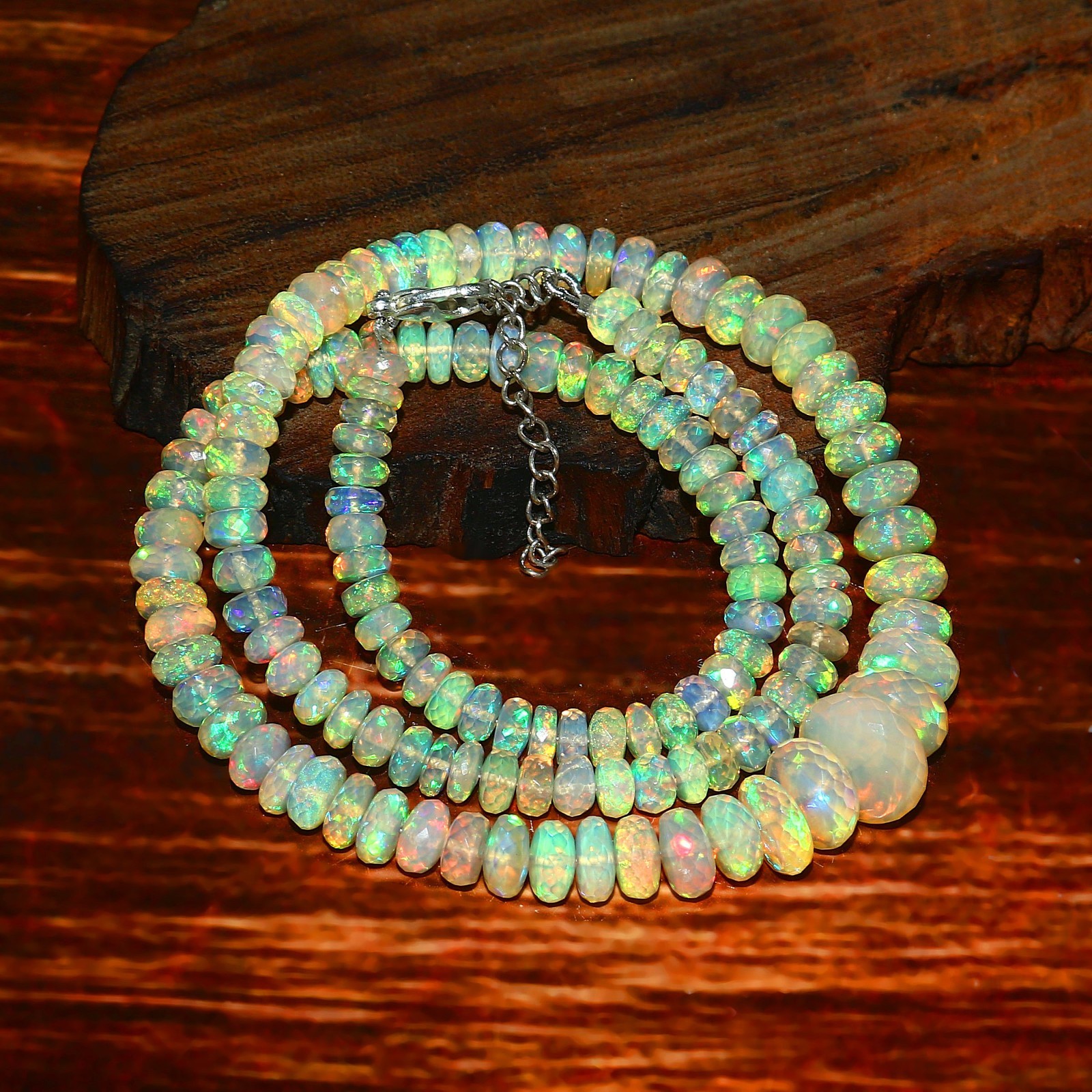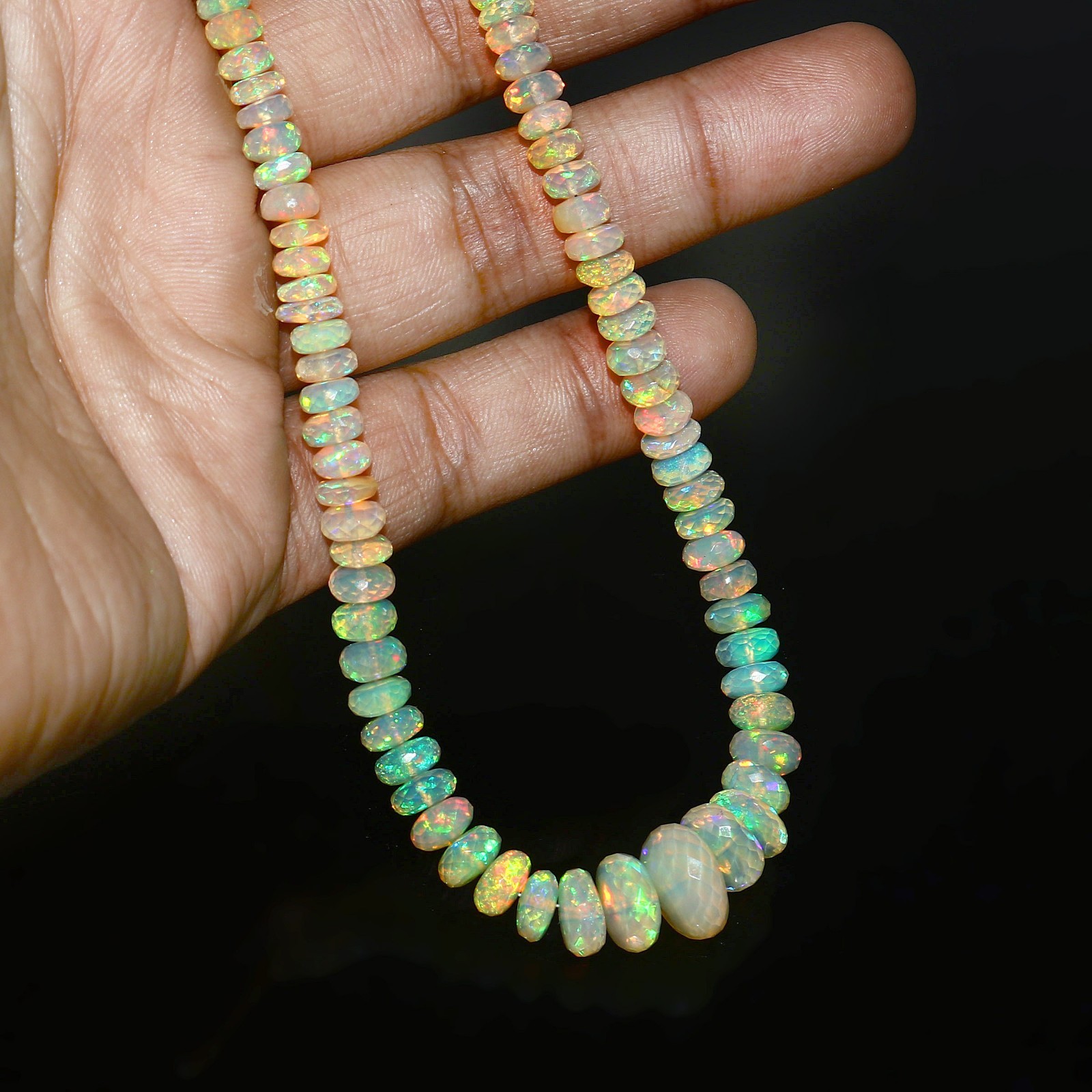 This stunning necklace features a genuine Ethiopian Fire Opal in a unique tyre shape. The faceted beads gemstone is set on a 17-inch polished form, with a round gemstone shape and a depth of 0.5mm. The gemstone color is a beautiful fire opal, with a heavy inclusion clarity grade and a certification from GIA. The necklace is vintage and has not been enhanced, with a weight of 62 cts. It is a one-piece unit, with a size of 4-6mm and a gemstone treatment of not enhanced. The item is from India and has been manufactured in Ethiopia. It is a perfect additio8