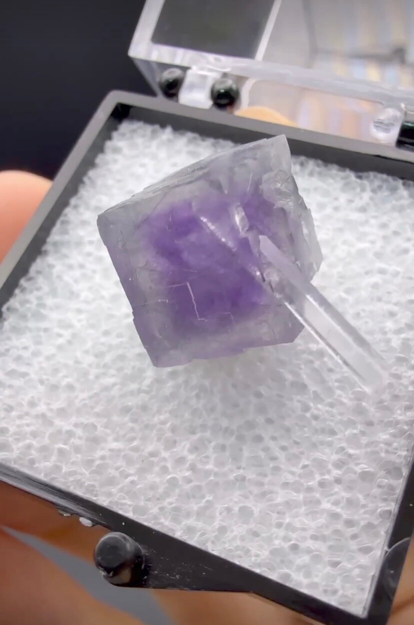 A purple fluorite and a crystal grow together. The crystal emerges from within the fluorite. Amazing nature! From Yuhuangshan, Hunan Province, China.