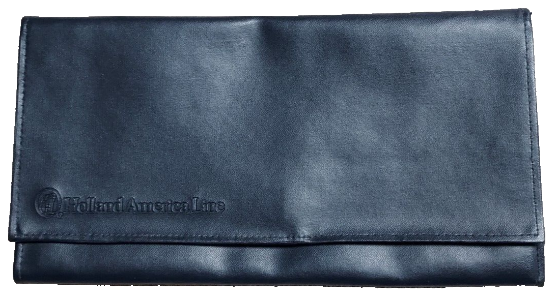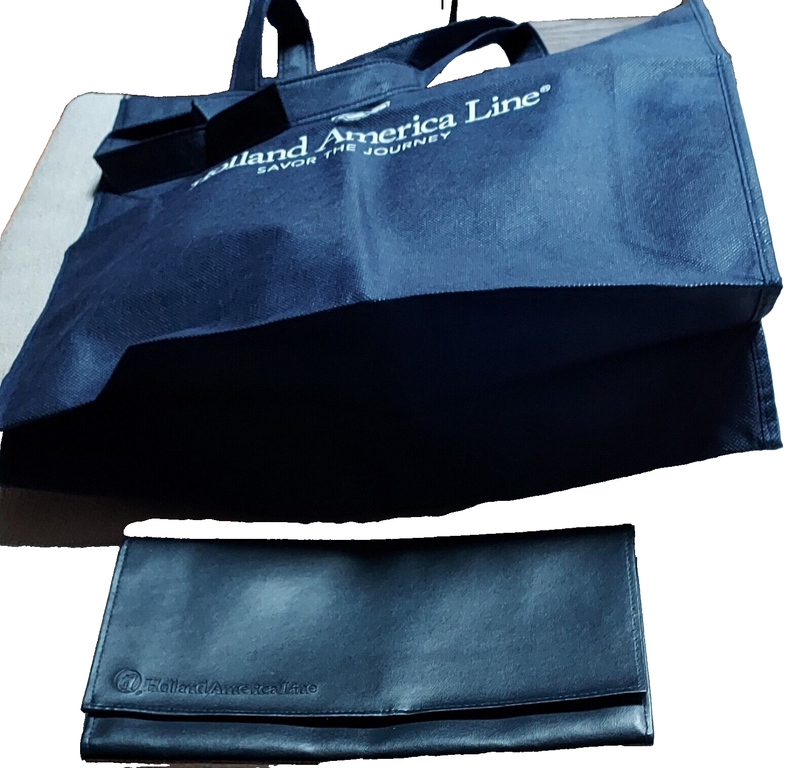 HOLLAND AMERICA Travel Organizer passport,ticket,voucher.Navy Blue.Bifold,clear window pockets,pouch.Hook and Loop closure.Holland America Logo in bottom front. Height closed=5.2";Opened=9.5" Width=9.5" Depth=1";Expanded=2" Reusable Holland America bag,Navy blue,Double top handle(See photo) Holland America Line ,ship logo,"Savor the journey" Height=15" Width=15" Depth=5"(Expanded) Strap=22" Do Not machine wash bag.Handwash only.