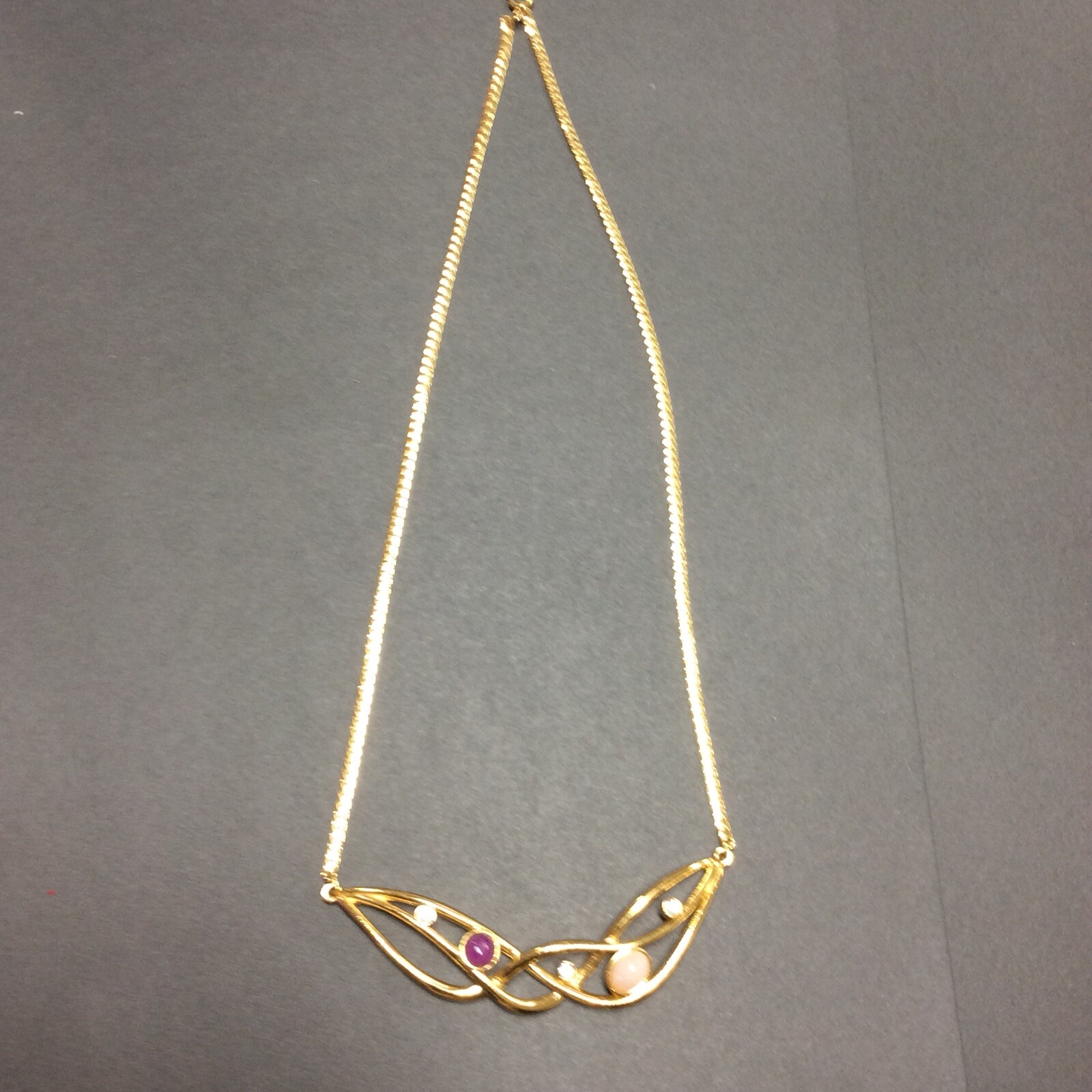 Necklace. From the clasp to the end of the chain it measures 7.5” long.There are 3 diamond like stones, one purple and one light pink. These are Not real stones.