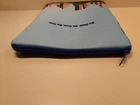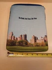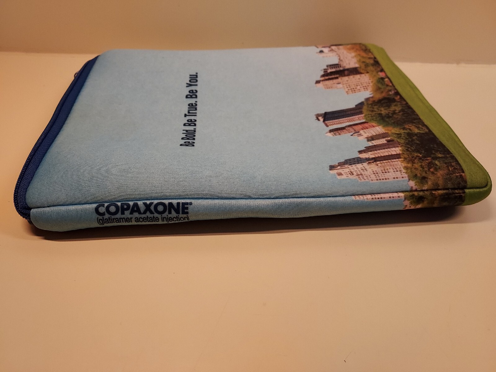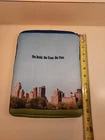Neoprene Sleeve / Soft Case for an iPad, E-reader or tablet. Medical Promo piece. Cityscape graphics on front. Solid coloration with text on back. Thin cushioning inside. Zipper closure.