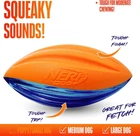 Nerf Dog Rubber Football 6 in Squeak Football-Blue/Orange, Blue, Orange Product Details Item Weight: 4.8 ounces Manufacturer: Gramercy Products, Inc. Country of Origin: China Item model number: 3221 Item Package Dimensions L x W x H: 6.8 x 3.2 x 3.2 inches Item Dimensions LxWxH: 3 x 6 x 3 inches Brand Name: Nerf Dog Target Audience Keyword: dogs Color: Blue, Orange Size: 6 in Squeak Football-Blue/Orange Material: foam rubber/ durable TPR Number of Items: 1 Style: Large (Pack of 1) Breed Recommendation: Medium, Large Is Discontinued By Manufacturer : No Product Dimensions : 3 x 6 x 3 inches; 4.8 ounces Item model number : 3221 Manufacturer : Gramercy Products, Inc. Country of Origin : China NERF-TOUGH: Nerf-quality materials make our Squeak Football perfect for fetch and for teaching your dog new tricks HIGH VISIBILITY: The bright blue and orange football is easily trackable for both you and your pet, no matter where or how far you toss it MADE TO LAST: Lightweight, durable, and weather & water resistant FOR MEDIUM AND LARGE BREEDS: Larger diameter football is ideal for medium and large breeds SAFETY FIRST: Designed with you dog's safety in mind, each of our dog toys are tested to ensure endless hours of family fun Stay in the game with the Nerf Dog Mega Tough Hydrosport ball! The unique combination of tough foam rubber and durable TPR stands up to extended chewing and makes an interactive squeaking sound that dogs love. Great for toss and fetch, or solo play sessions. And, it floats!.