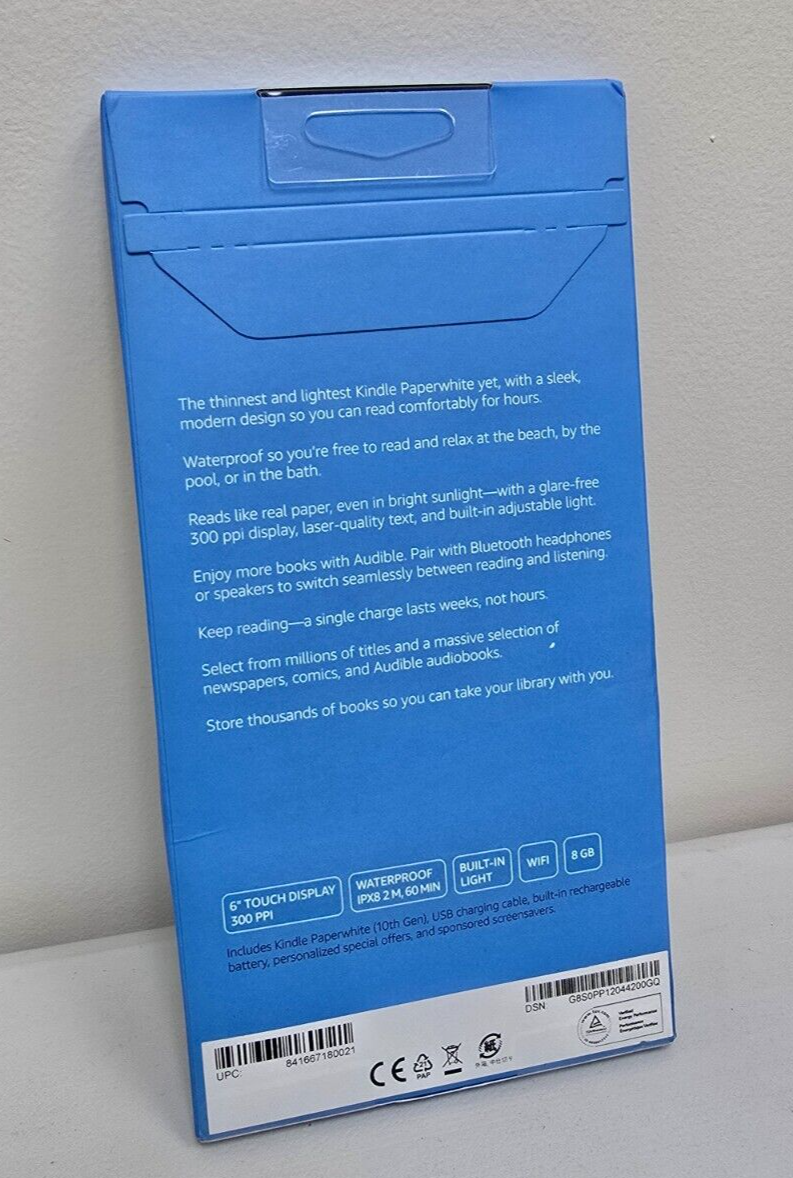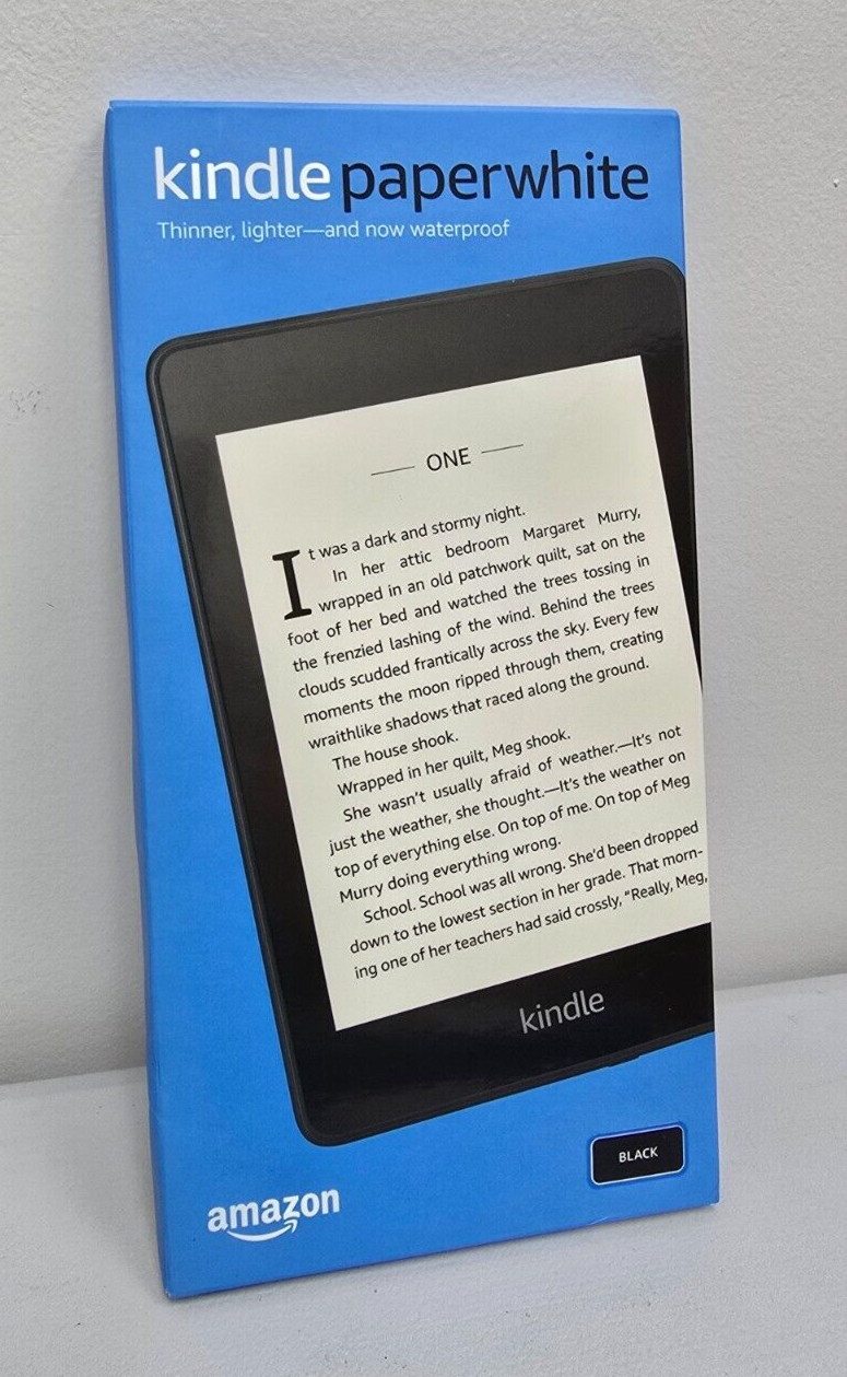 Brand New item, sealed . Thin, light Kindle Paperwhite—with a flush-front design and 300 ppi glare-free display that reads like real paper even in bright sunlight. Now waterproof , so you’re free to read and relax at the beach, by the pool, or in the bath. Your Kindle has been tested to withstand accidental immersion in water. Enjoy storage with 8 GB . Now with Audible. Pair with Bluetooth headphones or speakers to listen to your story. A single battery charge lasts weeks, not hours. The built-in adjustable light lets you read indoors and outdoors, day and night.