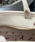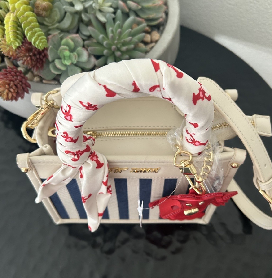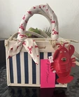 The New Betsey Johnson XOLUCY Satchel Crossbody Bag in Navy Multi is a stylish and versatile accessory for women. This small bag features a striped pattern with a zip closure and double cream handles. The exterior is made of canvas and faux leather in navy, cream, and red colors, with gold tone hardware. It comes with a detachable strap and bag charm, making it perfect for various occasions such as travel, beach outings, or nautical-themed events. Thank you, GBC!