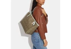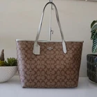 New COACH CITY TOTE IN SIGNATURE CANVAS Khaki/Light Sage 5696 $398 Signature coated canvas with smooth leather details Inside zip pocket Dogleash clip closure Handles with 9 1/2" drop 13" (L) x 11 1/2" (H) x 6 1/4" (W)