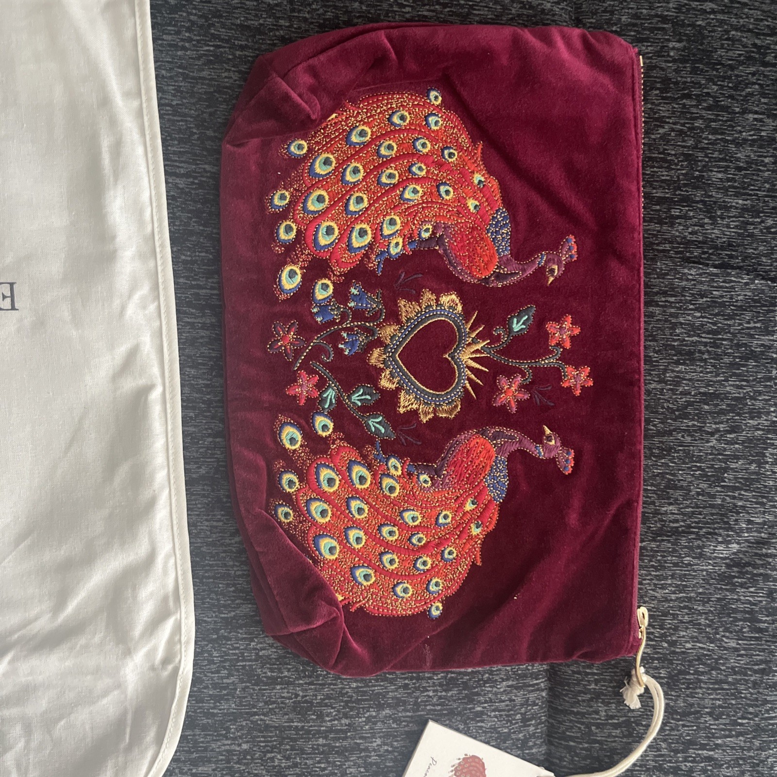 The New Elizabeth Scarlett Ruby Red Embroidered Velvet Peacock Floral Everyday Pouch is a luxurious clutch designed for everyday use. Made of velvet with embroidered peacock floral accents, it features a gold hardware closure and a lined interior made of cotton. The pouch is a stylish accessory for women who appreciate attention to detail and quality craftsmanship. Its unique design and vibrant ruby red color make it a standout piece in any wardrobe. Perfect for adding a touch of elegance to any outfit, this pouch from Elizabeth Scarlett is a must-have for those who value both fashion and functionality. if you have not tried Elizabeth Scarlet before you are in for a treat. They are very high-quality and hard to get. This one is sold out and rare get it while you can't.