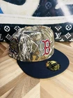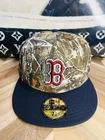 This is a New Era 59fifty baseball cap in size 7 3/8 with a camo pattern featuring the Boston Red Sox Rahnni logo. The cap is part of the Ecapcity Real Tree collection, showcasing a rare design inspired by various themes including MLB, city life, and classic baseball. It is made of polyester material and is perfect for casual wear during the summer, fall, or spring seasons.