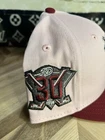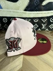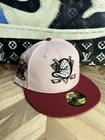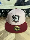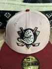 This New Era Capsule Rahnni Mystery Mighty Ducks NHL Hat in size 7 1/2 is a pink polyester hat featuring a solid pattern with an upside down logo theme. It is part of a special collection and is rare and classic, perfect for sports enthusiasts. Made in Vietnam, this hat is suitable for all seasons and is designed for men who appreciate unique and exclusive headwear.