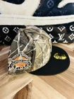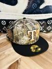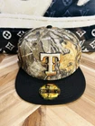This New Era baseball cap is part of the Myfitteds Horror Pack, featuring a Real Tree Camo design with the Texas Rangers logo. The cap is in size 7 3/4 and made of polyester fabric. It has a fitted style and is suitable for casual wear. The design includes elements from MLB, Capsule, Rushmore, and other themes, making it a rare and unique piece for any fan or collector.