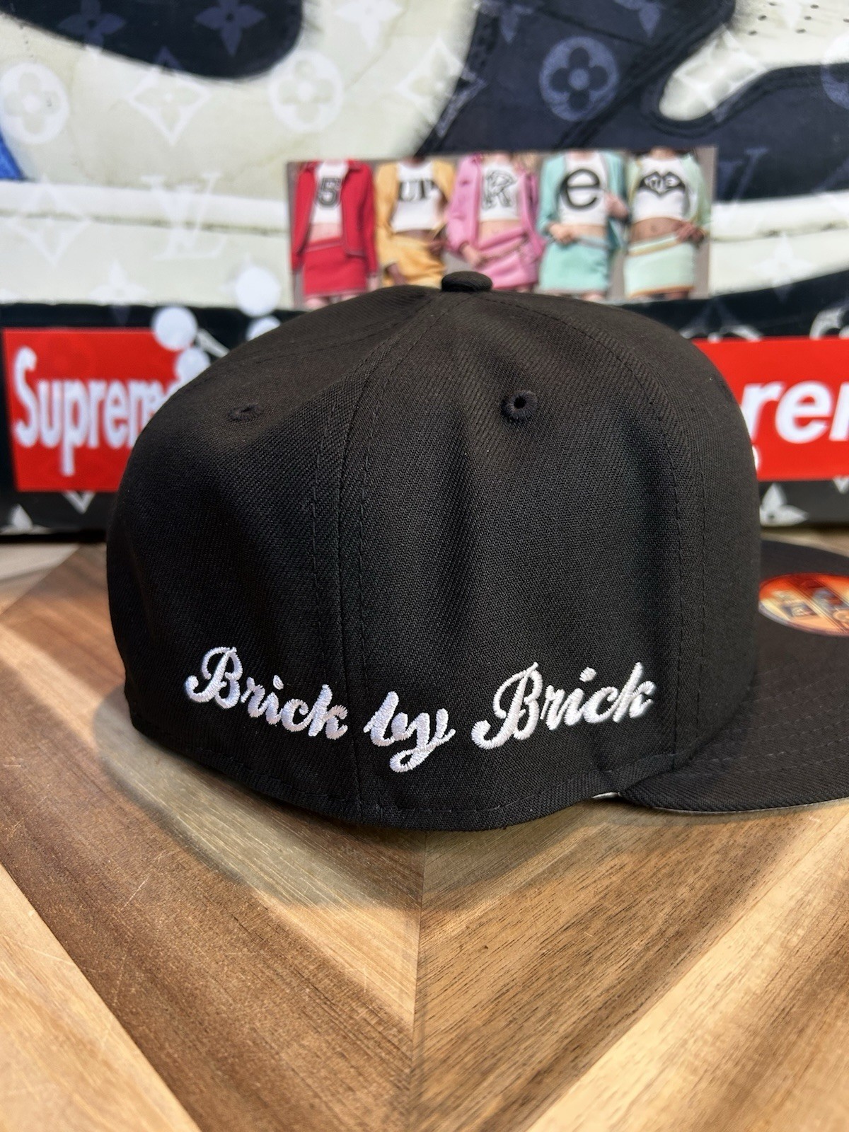 The product is a New Era Nigel Sylvester New York Yankees Black Jordan 4 Brick By Brick 7 1/4 baseball cap. This fitted cap features a solid black color with various character patterns such as Concepts, Kith, Supreme, and Bodega. Made from polyester fabric and branded with New Era, the cap is perfect for a casual occasion in the summer, fall, or spring seasons. The cap is part of the 59fifty product line and does not have a vintage or personalized design. It belongs to the MLB theme and showcases iconic New York Yankees logos.