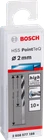 New Genuine Bosch 2608577188 HSS Twist Drill Bit PointTeQ For rotary drills/drivers Diameter (D) mm: 2.00 Working length mm: 24 Shank diameter (d) mm: 2 Choose a pack size: 10 Pcs For rotary drills/drivers HSS Twist Drill Bit PointTeQ enables fast drilling in metal due to PointTeQ tip design Self-centering tip prevents wandering, making quick and easy drilling starts possible Increased drilling rate generates less heat and wear Cylindrical shank compatible with three-jaw drill chucks. Fast Drilling in Metal HSS Twist Drill Bit PointTeQ enables fast drilling in metal due to PointTeQ tip design Increased drilling rate generates less heat and wear PointTeQ tip design remains sharp and ensures continuous durability Low risk of breakage due to highly elastic body, black-oxide coated flute; DIN 338, Type N, 135-degree tip There is a low risk of breakage, especially for drill bits below 6 mm in diameter as the bit is manufactured to have a highly elastic body. Its black-oxide coated flute provides fast chip removal. The HSS Twist Drill Bit PointTeQ is manufactured to DIN 338. The drill bit is Type N (flute angle) with a tip of 135 degrees. It has a cylindrical shank system and is intended for use in drill stands and drill drivers.