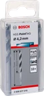 New Genuine Bosch 2608577210 HSS Twist Drill Bit PointTeQ For rotary drills/drivers Diameter (D) mm: 4.20 Working length mm: 43 Shank diameter (d) mm: 4.2 Choose a pack size: 10 Pcs For rotary drills/drivers HSS Twist Drill Bit PointTeQ enables fast drilling in metal due to PointTeQ tip design Self-centering tip prevents wandering, making quick and easy drilling starts possible Increased drilling rate generates less heat and wear Cylindrical shank compatible with three-jaw drill chucks. Fast Drilling in Metal HSS Twist Drill Bit PointTeQ enables fast drilling in metal due to PointTeQ tip design Increased drilling rate generates less heat and wear PointTeQ tip design remains sharp and ensures continuous durability Low risk of breakage due to highly elastic body, black-oxide coated flute; DIN 338, Type N, 135-degree tip There is a low risk of breakage, especially for drill bits below 6 mm in diameter as the bit is manufactured to have a highly elastic body. Its black-oxide coated flute provides fast chip removal. The HSS Twist Drill Bit PointTeQ is manufactured to DIN 338. The drill bit is Type N (flute angle) with a tip of 135 degrees. It has a cylindrical shank system and is intended for use in drill stands and drill drivers.