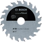 New Genuine Bosch 2608837666 Standard for Wood Circular Saw Blade For Cordless Saws Outer diameter mm: 85 Number of teeth: 20 Width of cut (b1) mm: 1.1 Choose a pack size: 1 Pcs For hand-held circular saws Standard for Wood Circular Saw Blade for cordless saws and dry-cutters maximises battery runtime Extra-thin kerf reduces power consumption High-quality carbide teeth guarantee reliable cutting results Bore works with or without reduction rings to fit different sizes. For Maximum Battery Runtime Standard for Wood Circular Saw Blade for cordless saws and dry-cutters maximises battery runtime High-quality carbide teeth guarantee reliable cutting results Aggressive tooth angles enable smooth cutting performance Carbide teeth for high-quality results; expansion slots notably reduce noise and heat The Standard for Wood Circular Saw Blade enables reliable cutting results thanks to its high-quality carbide teeth. Expansion slots notably reduce noise and heat while working. The blade fits all common cordless plunge and handheld saws as well as cordless dry-cutters.