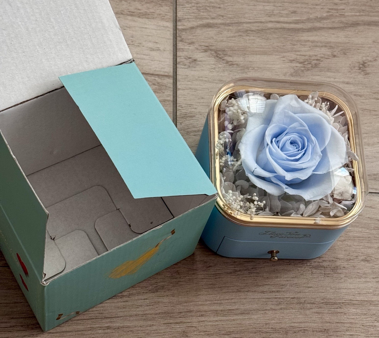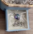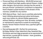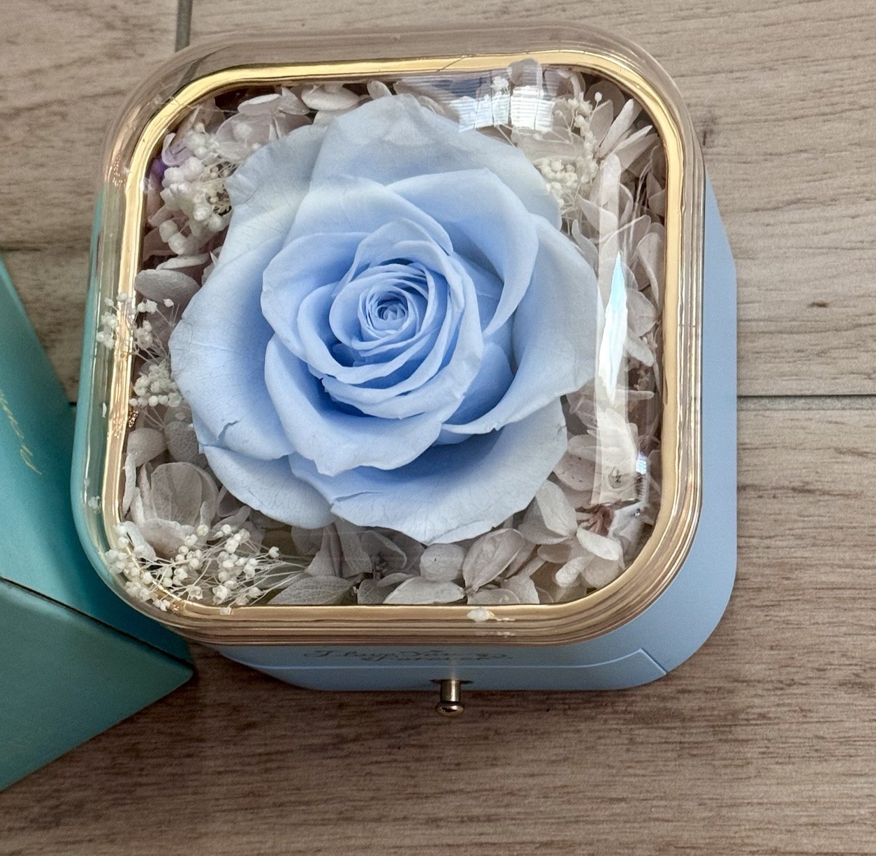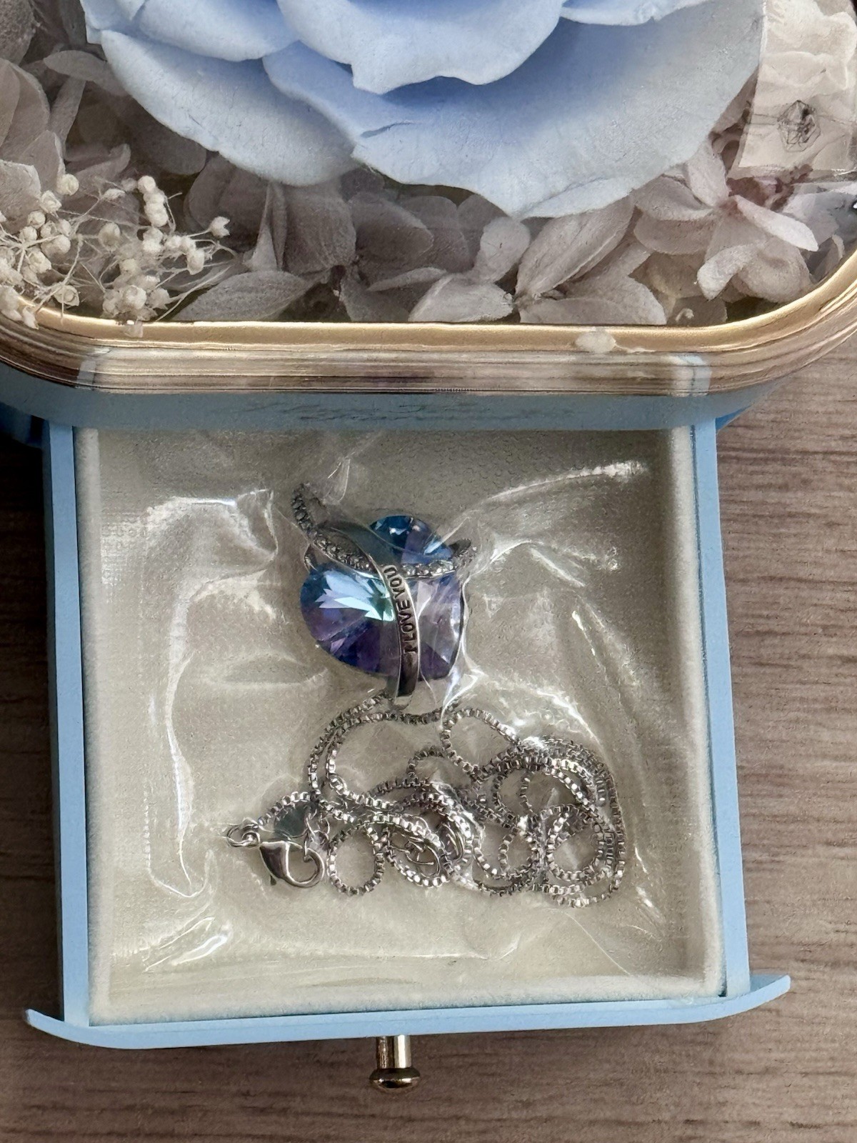 New in box. This Light Blue Rose with Heart Necklace by WILDLOVE is a charming pendant featuring a heart-shaped blue charm with a lobster closure. The necklace is adjustable and perfect for gift-giving to women who appreciate meaningful jewelry. The forever flowers design symbolizes eternal love, making it a thoughtful and romantic gift for any occasion. Made with materials sourced from China, this necklace is a beautiful and unique piece that adds a touch of elegance to any outfit.