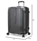 Description Durable hard-shell construction with riveted corner guards offer great protection. Textured finish prevents abrasive scratches and finger prints. Aluminum telescopic handle system with push-button mechanism provides easy maneuverability. 360-Degree spinner wheel system provides wide wheel base for better traction and stability. #10 Main zipper makes opening and closing a breeze. 2-Inch expansion gusset allows 25% more packing capacity. Main compartment features a claim-shell opening. Interior includes cross-tie straps, zippered divider, and pockets for extra storage. 26” medium check-in spinner overall Dimensions: 25.5”H x 17”w x 11”d + 2” expansion packing capacity: 24”h x 17”w x 10.5”D + 2” expansion linear inches: 53.5 weight approx. 9.5 lbs. Durable hard-shell construction with riveted corner guards offer great protection Aluminum telescopic handle system with push-button mechanism provides easy maneuverability 360-Degree spinner wheel system provides Wide wheel base for better traction and stability Interior includes cross-tie straps, zippered divider, and pockets for extra storage 26” spinner overall Dimensions: 25.5”H x 17”w x 11”d + 2” expansion (product weight 9.5 lbs.); 26” spinner packing capacity: 24”h x 17”w x 10.5”D + 2” expansion Special Features: Telescoping Handles;Expandable;Tsa Approved