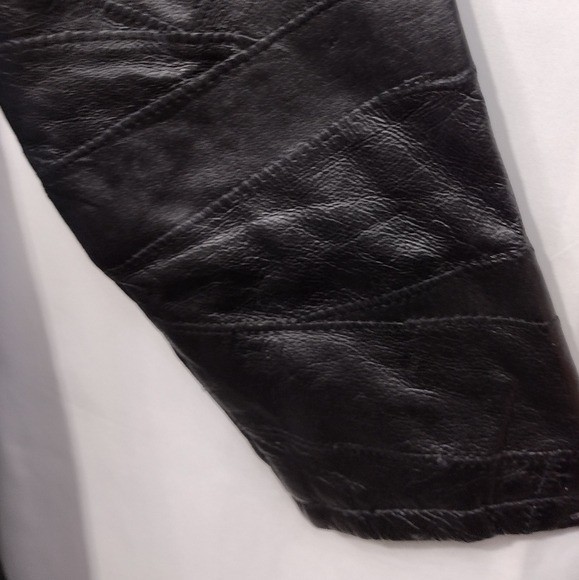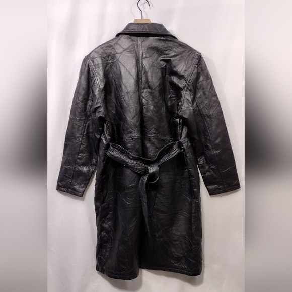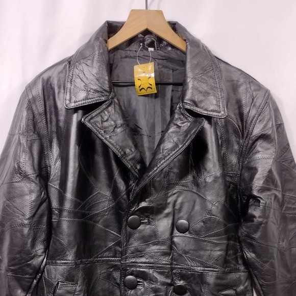 Elevate your style with this sleek black leather coat. Perfect for any occasion, it offers both comfort and sophistication. Features Black Patchwork Collared Double breasted Back tie Lined Boho Retro 90s Y2K Casual Comfy Grunge Rockabilly 100% Leather NWT SIZE M based on measurements, please check to be sure of fit. Measurements Pit to Pit: 19.5" Length: 42" Waist: Rise: Inseam: Length: Please check to be sure of fit Smoke Free Pets Free Please feel free to contact me for any questions or offer Bundle Discounts Offered Fast Shipping *5906-H-25*