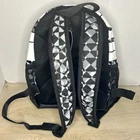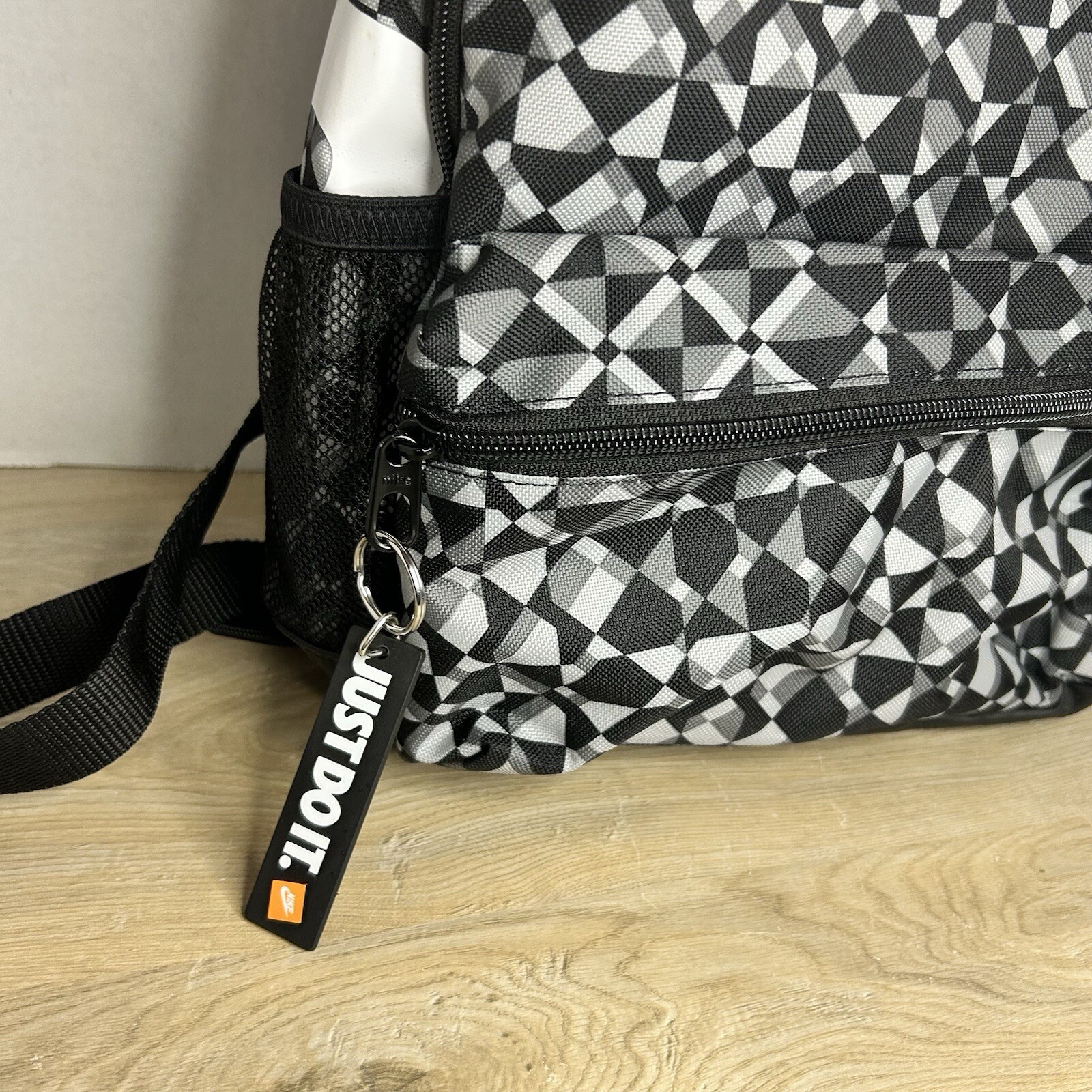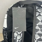 New Nike Brasilia Just Do It mini backpack. Black, gray and white geometric pattern. Measures approx 12” x 10” x 4”.