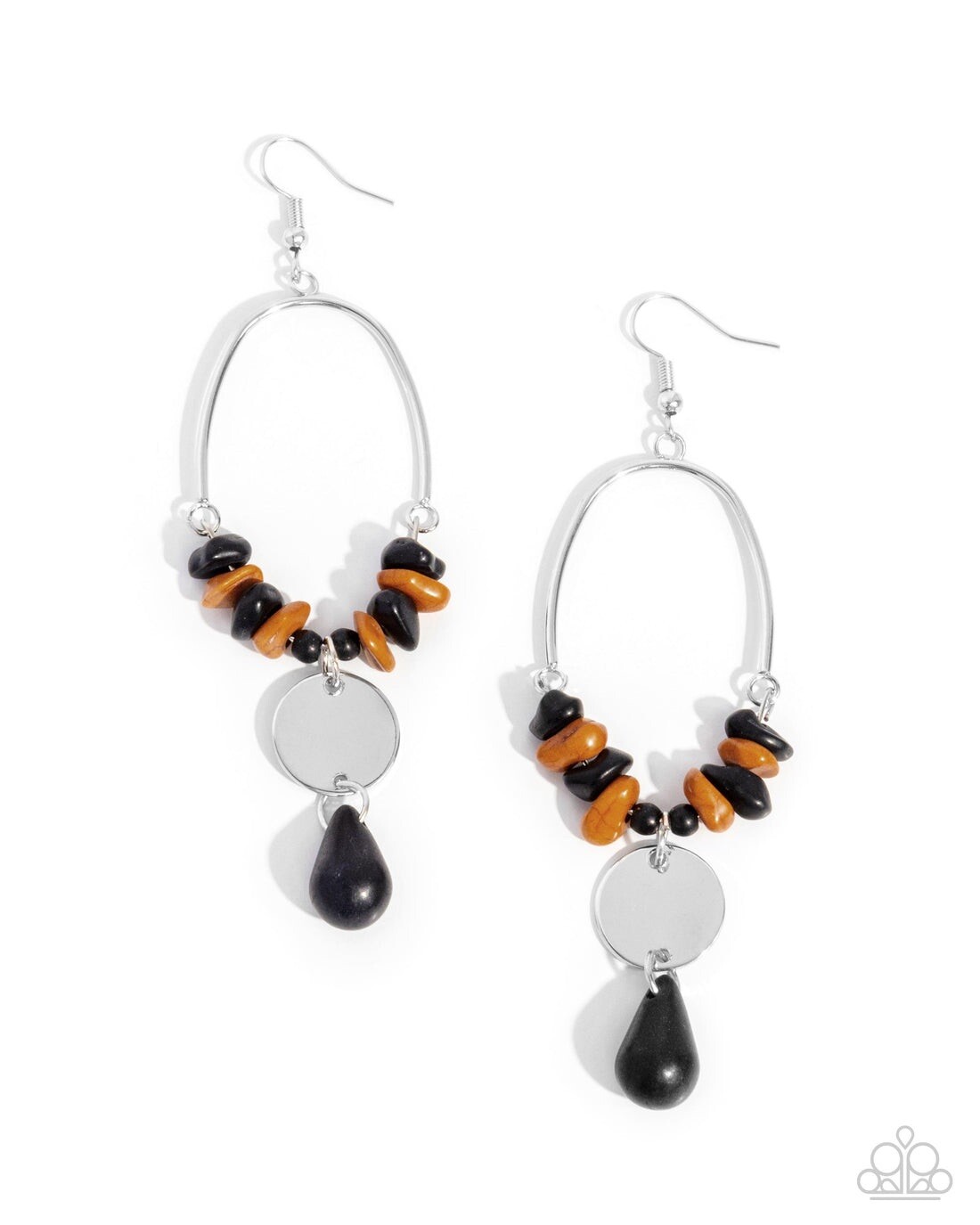 Connected to a silver half-oval frame, chiseled black and brown stone pebbles, and black stone beads create an indulgent border around the bottom of the frame, giving way to a silver disc and solitaire black teardrop stone for a demurely refreshing lure. Earring attaches to a standard fishhook fitting. As the stone elements in this piece are natural, some color variation is normal