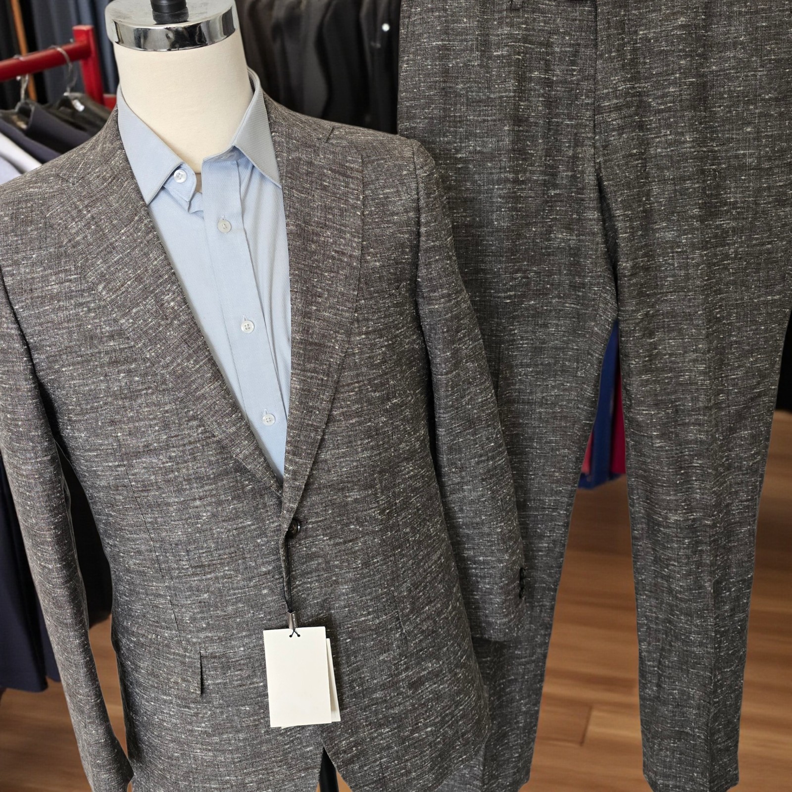 Size: 42r USA slim fit with 24-inch arm length and a jacket length of 30 inches. Pants: 35x33 drop 7 For complete measurements, see photos #2 and #3 To see exactly how we measured, see the last series of photos. Extra fabric for adjustments: Waist: 3.5 inches Inseam: 2.5 inches Arms: 1 inch Color and fabric: woven melange linen wool silk with strong brown and gray undertones Condition: new with tags on the jacket. Never worn. The vent and sleeves tailor yarn has been removed. No flaws/never worn E.thomas linen wool silk, working cuff, 4 inch lapels, dual vent, 4 seasons weight, melange Return policy: We offer free shipping and no returns. We can not afford to offer both in the highest return category on eBay. It becomes very expensive to mail out items for free for people to try on if they are not confident in checking the measurements in picture #2. If you prefer to have the ability to return the item and pay $12.95 shipping, please send us a message, and we can change the listing format to offer returns. The $12.95 shipping cost would break us out even in the case you needed to return the item. You must contact us before purchasing as some of our items are on consignment and we will need to get the owners approval before proceeding. We ship the next business day after the payment is made. A discounted, expedited shipping option is available at checkout. If you need help figuring out how to buy a blazer or suit on ebay that actually fits you properly. There are some fantastic videos on You tub e