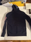This is a genuine New York Yankees hoodie in navy color, size Small. It features patches and is officially licensed Major League Baseball merchandise. Perfect for fans looking to show their support for the team in a stylish way.