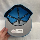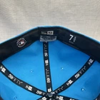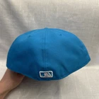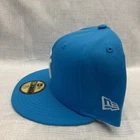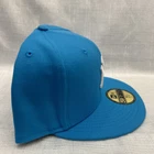This is a New York Yankees New Era 59FIFTY Fitted Cap in size 7 5/8. The cap is light blue with white accents and features the MLB New York Yankees character family logo. Made of polyester and wool, it is a solid baseball cap style suitable for men who are fans of the team or interested in sports-themed accessories.