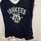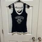 The product is a women's tank top shirt in size large, featuring the New York Yankees team logo in white script on a blue background. It is officially licensed MLB Genuine Merchandise by Campus Lifestyle, making it a genuine fan apparel item for Major League Baseball fans. This shirt is suitable for wearing during the regular season to show support for the New York Yankees in a stylish and comfortable way.