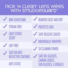 Nice 'n Clean SmudgeGuard Lens Cleaning Wipes (100 100 Count (Pack of 1) Product Details Product Dimensions : 3.07 x 4.53 x 3.94 inches; 9.91 ounces Item model number : X0001B100CH Manufacturer : Nice 'N Clean Scent: Citrus Brand: Nice 'N Clean Sheet Count: 100 Package Information: Box Item Form: Wipes EFFECTIVELY REMOVES DUST AND DIRT: Nice N' CLEAN SmudgeGuard Lens Cleaning Wipes gently remove dirt and dust from a variety of coated lenses. SmudgeGuard technology allows for 3X the cleaning power compared to our standard lens wipes! PROTECT YOUR LENS: Our pre-moistened lens wipes provide streak-free and scratch-free removal of dust, smudges, and fingerprints on eyeglasses, camera lenses, sunglasses, goggles, and safety eyewear. SAFE ON ALL DELICATE LENSES: With an ammonia-free formula, our wipes are effective and safe on glass lens, plastic lens, and anti-reflective coatings. They are suitable for device lenses too, including iPhone, computer, and laptop video camera lenses. INDIVIDUALLY-WRAPPED: Each wipe is pre-moistened (unlike microfiber cloths) and individually-wrapped for convenience and moisture retention. They can be used on-the-go and kept in purses, backpacks and more for use at home, school or office environments. MADE FROM PLANT-BASED FIBERS: Our wipes are made from sustainable, plant-based fibers! These wipes are free of dyes, parabens, chemical binders, alcohol, chlorine, phthalates, etc. Life moves fast, and you want to be there to take in every moment. Nice 'N CLEAN Lens Wipes gently remove dust and dirt from a variety of lenses without leaving streaks or scratches, giving you the clarity you need to truly enjoy life. SmudgeGuard technology allows for 3x the cleaning power while providing streak-free and scratch-free removal of dust, smudges, and fingerprints. Our pre-moistened and individually-wrapped wipes are designed for on-the-go convenience for travel and storage purposes. These lens wipes are perfect for glasses, eyeglasses, sunglasses, goggles, camera lenses, and binoculars.