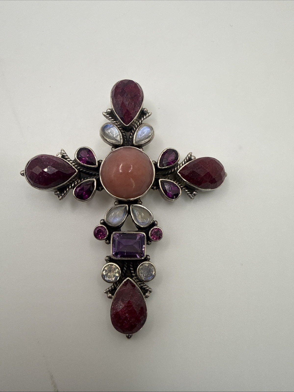 ✨ Nicky Butler Gemstone Cross Pendant & Necklace – Sterling Silver (925) ✨ Beautiful and eye-catching Nicky Butler cross pendant featuring a stunning mix of genuine gemstones set in solid sterling silver. This piece has a bold, dimensional design with rich color and classic artisan detailing. Details: • Brand: Nicky Butler • Metal: Solid Sterling Silver (marked 925) • Country of Origin: India (stamped) • Gemstones: Mixed natural stones including pink center cabochon, ruby-tone faceted stones, moonstone, and purple stones (likely amethyst or garnet) • Pendant Style: Ornate gemstone cross • Includes: Pendant + necklace chain (as shown) • Finish: Oxidized sterling for depth and contrast Condition: Very good vintage condition. Stones are secure. Light surface wear consistent with age and normal use. Please review all photos for exact condition and details. This is a beautiful statement piece — perfect for collectors of Nicky Butler jewelry, gemstone lovers, or anyone who loves bold, spiritual-inspired designs. 💖✝️ ✨ Offers are welcome — feel free to send one! 💌📬
