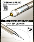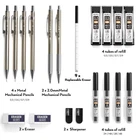 Come with 6 PCS drafting pencils and 8 tubes of lead refill in 0.3mm 0.5 mm & 0.7mm & 0.9mm (HB) + 2.0 mm(4B, 2B, HB, 2H) carbon based , 2 pcs erasers, 9 pcs cap eraser refill, 2 lead sharpener, updated storage case packaging The full-brass metal body provides ideal weight balance for fatigue-free writing and drawing. It brings you more effective and high quality tasks. 4 PCS Mechanical Pencils : 4 mm tip length makes it ideal for use with rulers and templates, various line size (0.3 mm,0.5 mm,0.7 mm & 0.9 mm) satisfy your demand. Polygon shape of these mechanical writing pencils avoids sliding on drawing tables. In addition, the pencil is pre-loaded with a 90mm-lead. 2 PCS 2mm Lead Holder: Metal Threaded Anti-skidding pen tube with sharpener in the cap of 2.0 mm mechanical pencil, Extra 2pcs lead sharpener are also provided for the 2.0 lead to keep the fine point as they dull. Perfect School Supplies:Ideals for artists, professionals, teachers and students alike. Perfect for writing, drafting, drawing, sketching