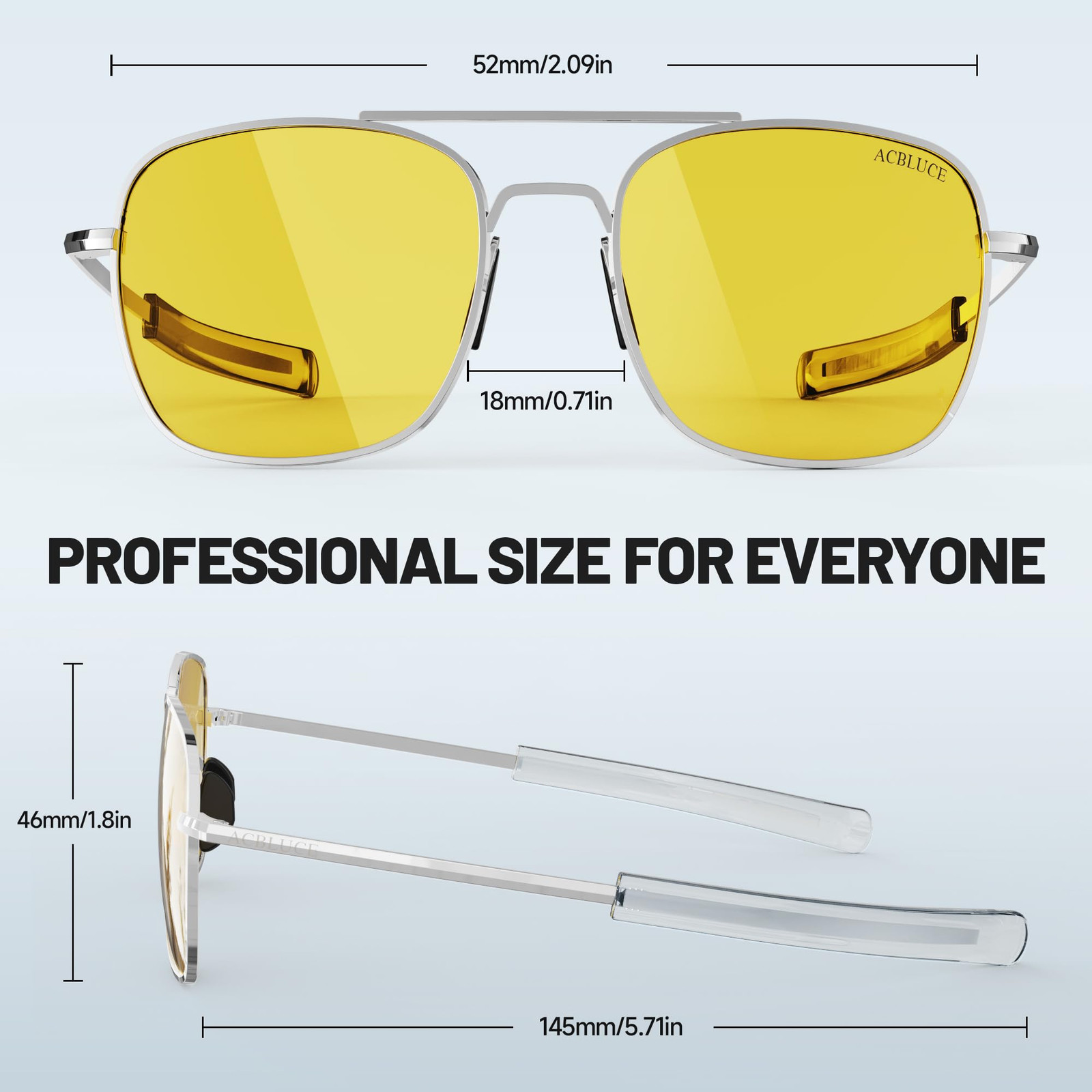 HD NIGHT VISION GLASSES: Yellow lens sunglasses reduce eye strain, enhance night vision, improve color clarity and optical definition. Ensure safety driving during the night. BAYONET TEMPLES - Stainless Steel frame with bayonet temples, curved inward to easily fit underneath helmets headgear or headphones for comfort, performance and protection. SKIN-FRIENDLY NOSE PADS - Environmental & skin-friendly soft and comfortable wearing for long-time wearing without fatigue. Nose pads can be removed and clean. CLASSIC AVIATOR SUNGLASSES - Lightweight design(26g only) is perfect for daily life, party, and all active outdoor lifestyles as driving, fishing, golf, military and air force etc. 53mm pilot sunglasses is perfect for Small&Midium Size faces. 30 DAY MONEY BACK : Customers can return and get refunded in case the purchasing is not satisfactory for any reason. Reliable customer service is our priority. SO NO RISK ON TRY!