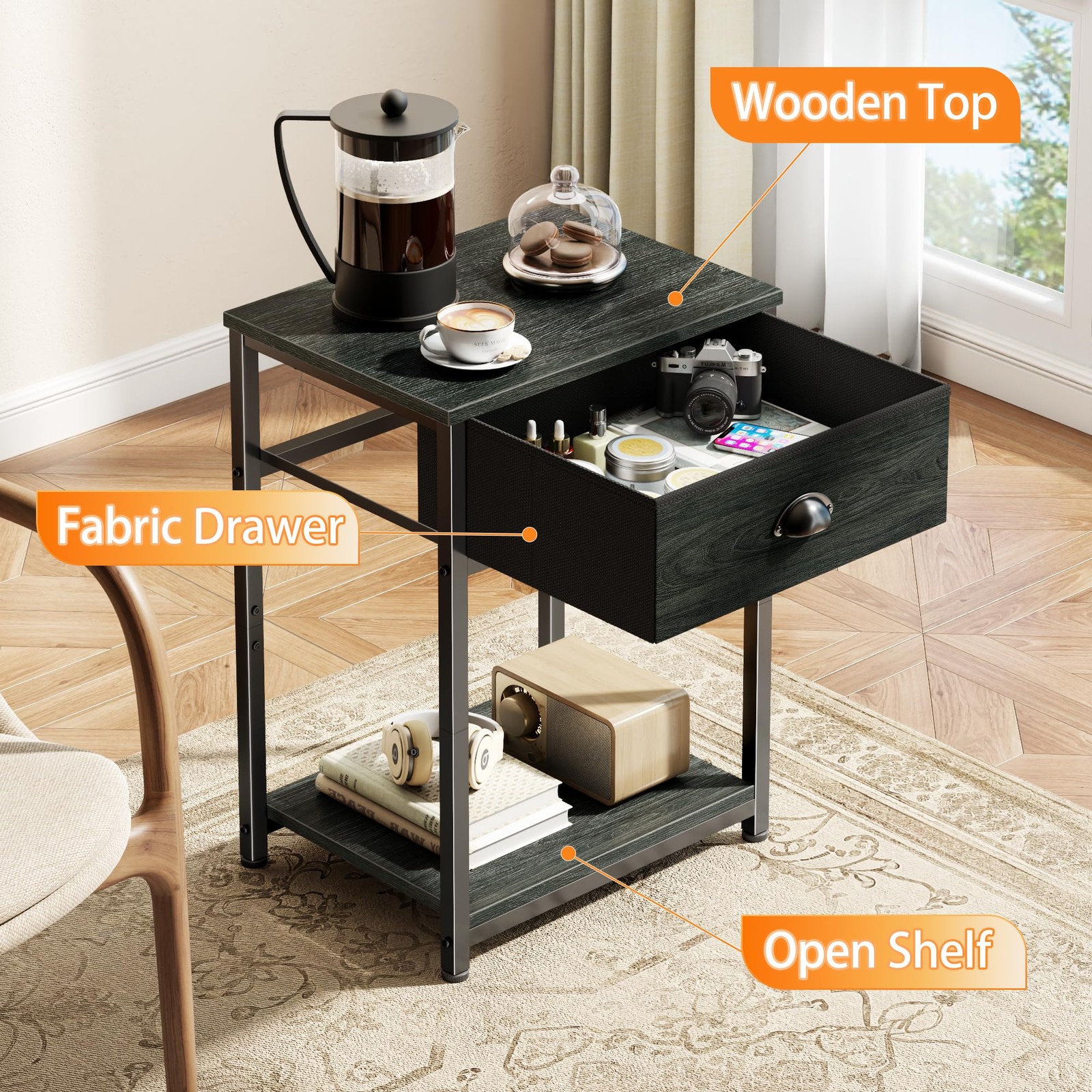 Nightstands Set of 2, Industrial End Table with Fabric Drawer&Storage Shelf, Small Bedside Table Organizer for Small Space, Side Table for Living Room, Tall 23.6" Night Stand for Bedroom, Black Oak Stable and Sturdy : This bedside table features a fabric drawer with sturdy particleboard panels and steel side frames, durable and load-bearing capacity up to 44 lbs.4 adjustable feet keep the table level to avoid scratching the floor. 3-Tier Storage Option: This tall side table includes 2 tiers of open shelves provide ample space for storage and display. The open top shelf is perfect for displaying picture frames and plants. A drawer with handles provides more space to personal items you want to put in. Multi-function Stand: You can place it in many places, such as a bedside table in your dorm room, a printer stand or a coffee table next to your sofa. Decorate your space with an industrial style nightstand. Upgraded Fabric Drawer: This metal end table features easy-pull arch handles and storage drawers made of high-quality non-woven fabric that is lightweight, breathable and prevent dust. The fabric drawer front is veneered with engineered wood in a oak look. Pretty Easy to Assemble: Modern Bedside table overall dimension: 11.42"D x 14.57"W x 23.62"H. Manual with detailed operation instructions, the hardware and tools included and each accessory is labeled for easy installation. We provides before and after purchase. If you have any questions, please feel free to us.