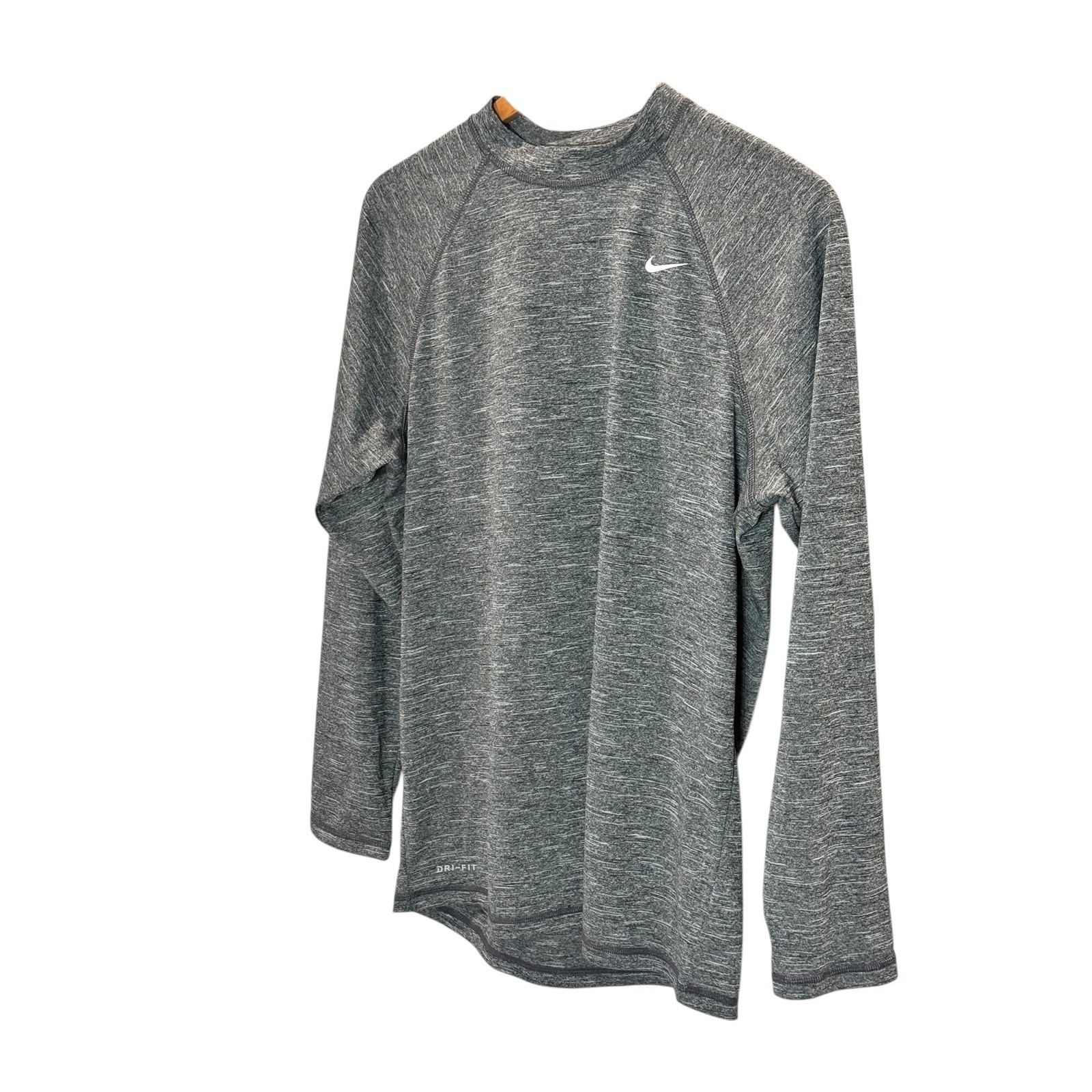 Conquer your workouts in this Nike Dri-FIT long sleeve athletic shirt. Engineered with advanced moisture-wicking technology, it keeps you dry and comfortable as you push your limits. The heathered gray fabric offers a modern, athletic aesthetic, while the raglan sleeves provide a full range of motion. Perfect for intense gym sessions, outdoor runs, or training days. Measurements: Armpit-Armpit 22", Length 27" Style: Pullover Performance/Activity: Gym & Training, Water Sports Product Line: Nike Dri-FIT Features: Moisture Wicking, Breathable, Lightweight Sleeve Length: Long Sleeve Closure: Pullover Neckline: Mock Neck Fit: Athletic Keywords: Nike Dri Fit, long sleeve shirt, athletic wear, workout top, training shirt, moisture wicking, performance gear, activewear, gym shirt, running top, heather gray, mens athletic, quick dry