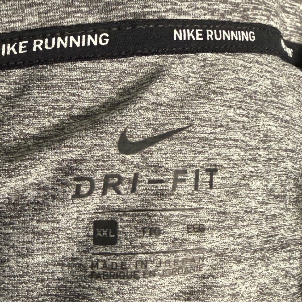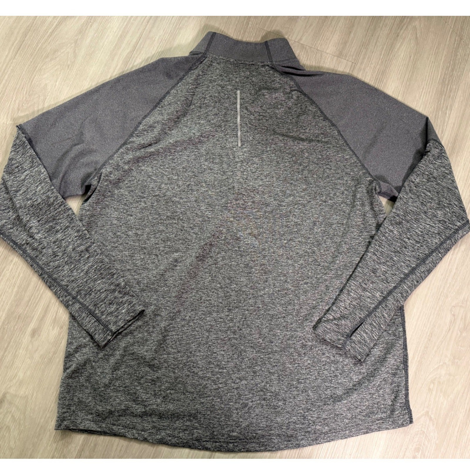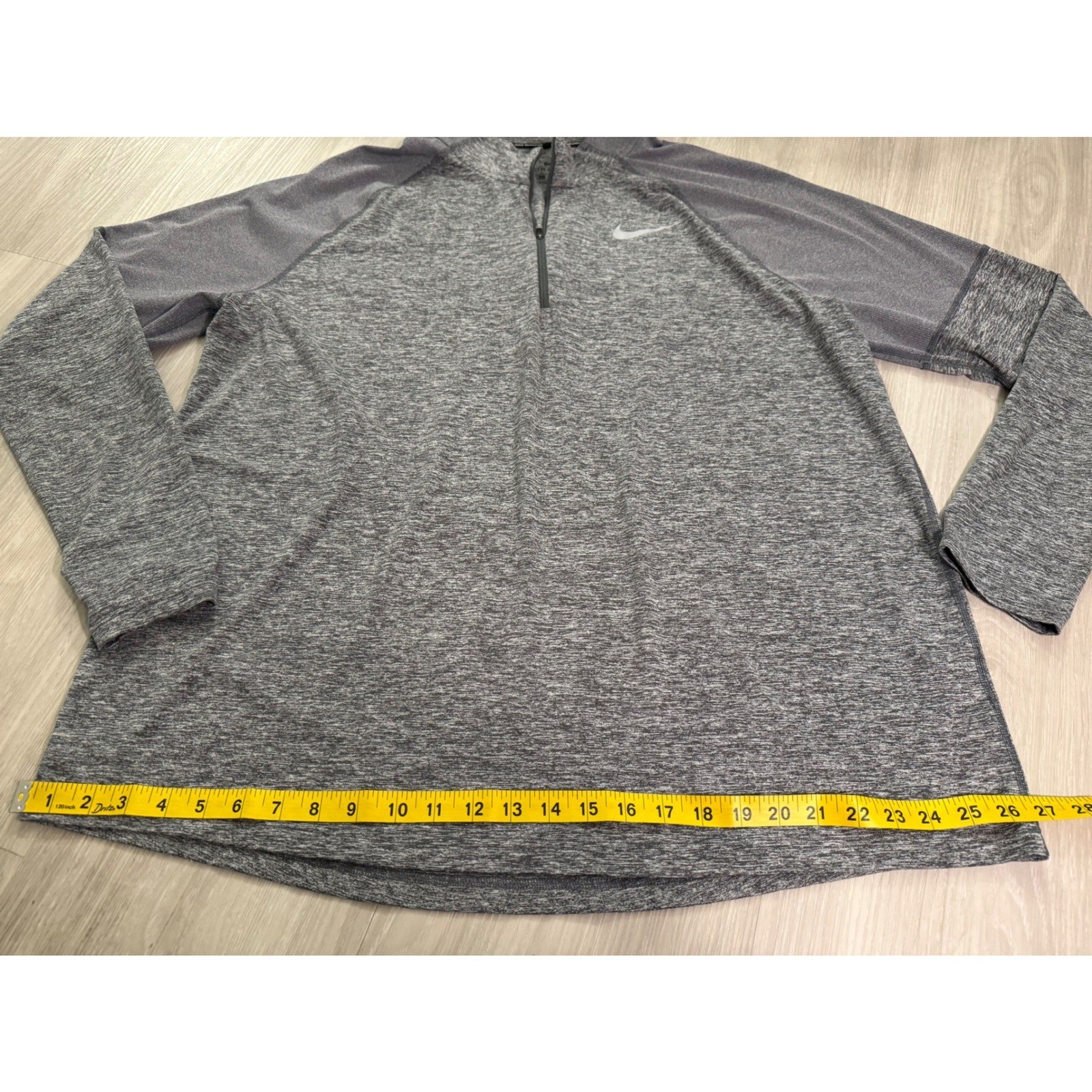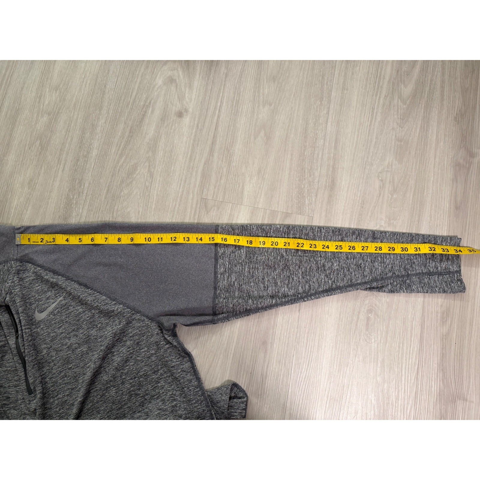 Conquer your miles with this Nike Dri-FIT quarter-zip running pullover. Designed for performance, this shirt offers a sleek, athletic fit that moves with you. The subtle heathered gray fabric is accented by contrasting darker gray sleeves and shoulders, creating a modern athletic aesthetic. Measurements: • Chest (pit to pit): 26 in • Length (shoulder to hem): 30 in • Sleeve Length (shoulder to cuff): 26 in • Hem Width: 25 in Department: Men Type: T-Shirt Style: Pullover Performance/Activity: Running & Jogging, Track & Field Product Line: Nike Pro Combat Dri-FIT Features: Moisture Wicking, Breathable, Quick Dry, Reflective Sleeve Length: Long Sleeve Fabric Type: Knit Closure: Zip Neckline: Mock Neck Fit: Athletic Pattern: Colorblock Keywords: Nike running, Dri Fit, mens athletic shirt, quarter zip, long sleeve activewear, heathered gray, performance gear, workout top, training shirt