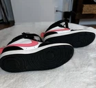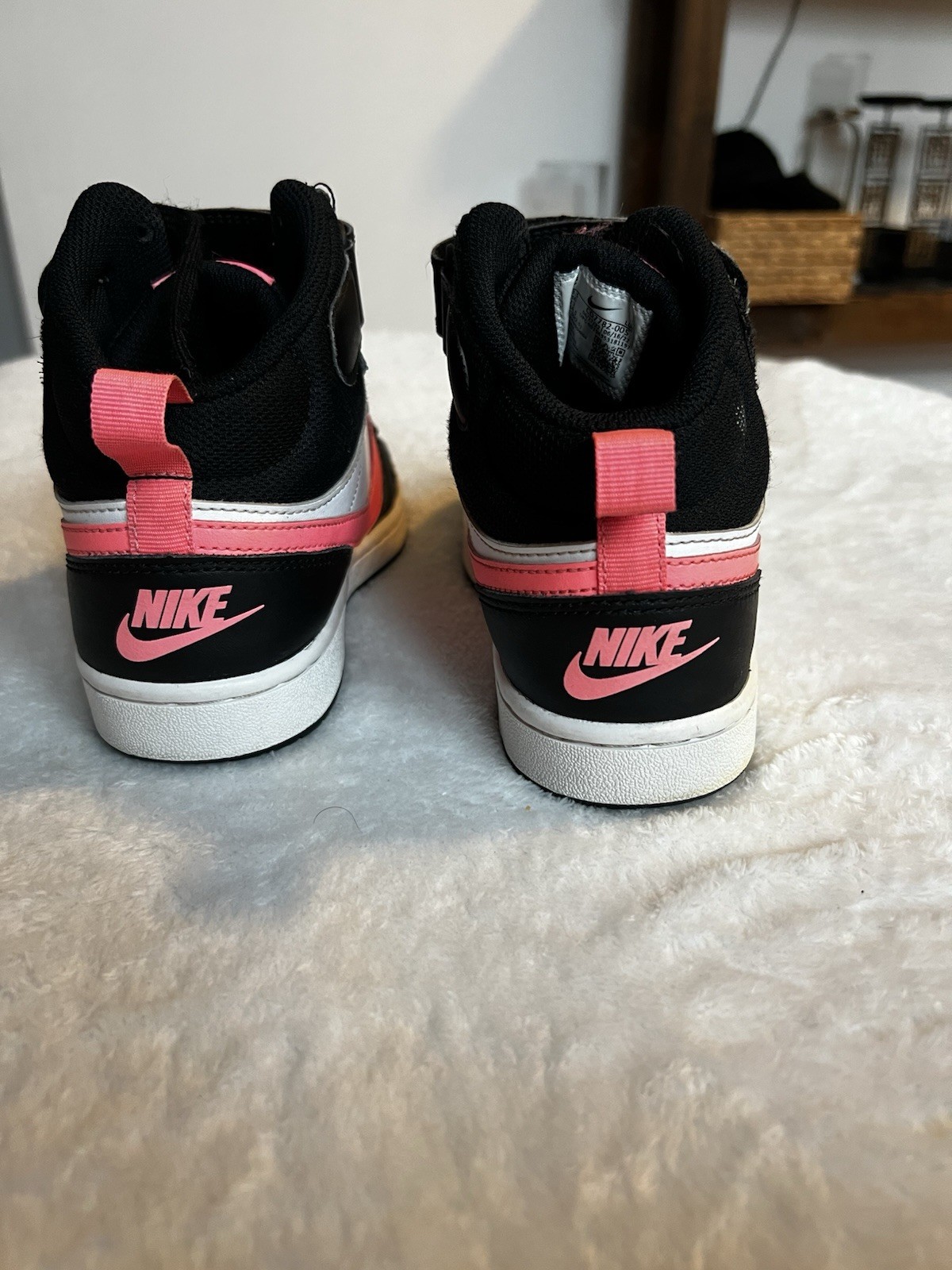 The Nike Kids Black and White Sneakers with Pink Accents in size 4 are a stylish choice for active girls. Featuring a round toe shape, lace-up closure, and flat heel, these sneakers offer comfort and support for running and jogging activities. With a solid black color and logo accents, these athletic shoes are perfect for summer, fall, and spring seasons. Made with a rubber outsole and foam insole, these Nike sneakers are a great addition to any young athlete's footwear collection.