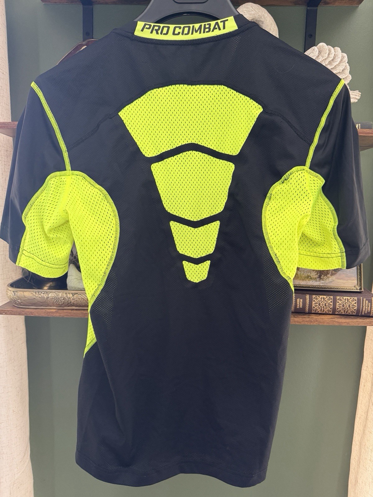 The Nike Pro Combat Fitted Training T-Shirt in size Small is a high-performance activewear top designed for men. Made with lightweight, breathable fabric that is moisture-wicking and stretchy, this black shirt features a crew neck and a pullover closure for easy wear. With a solid pattern and short sleeves, this t-shirt is ideal for various activities such as gym training, running, weightlifting, and more. The Nike brand is known for its quality athletic clothing, making this shirt a reliable choice for athletes and fitness enthusiasts looking for a comfortable and functional top.