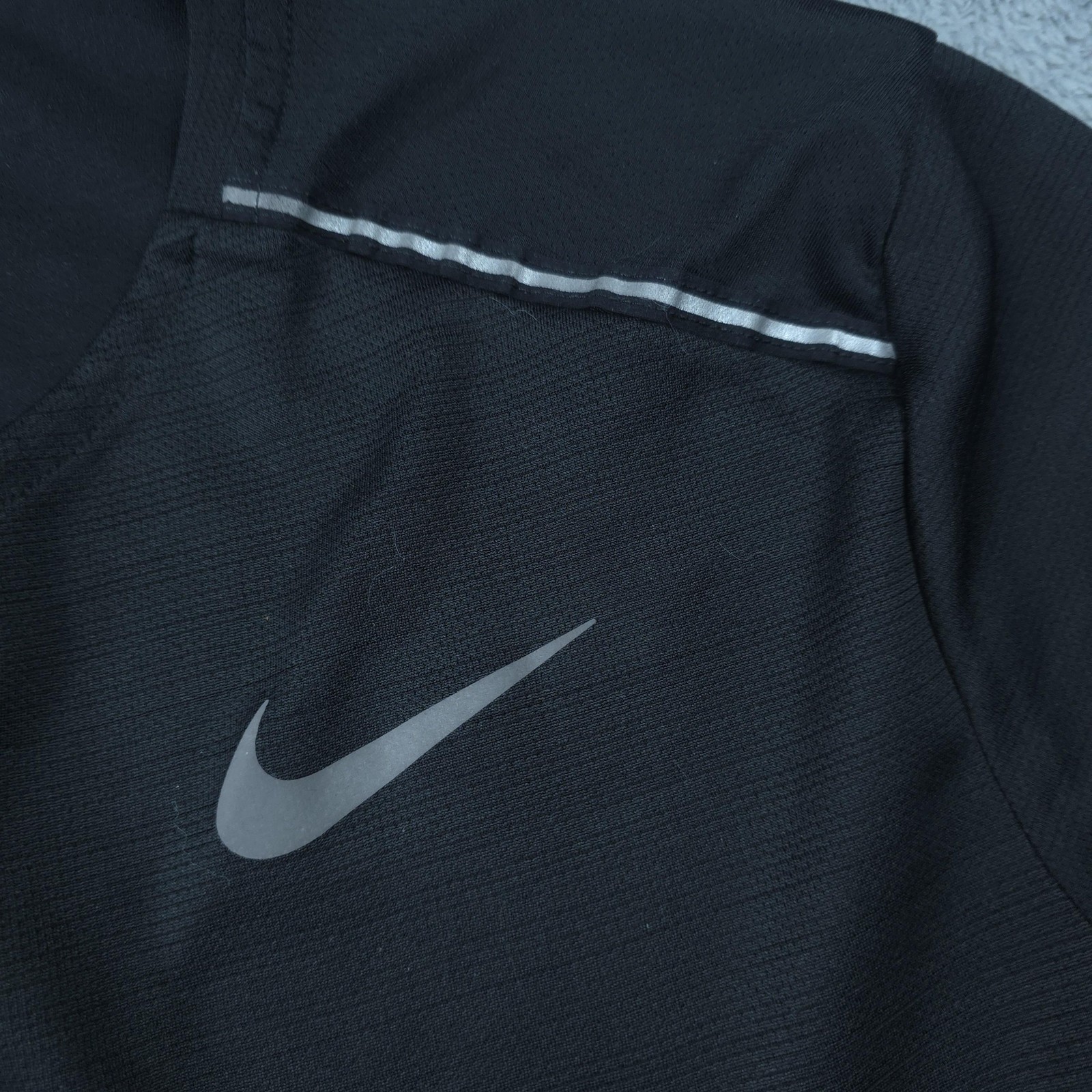 Brand: Nike Style: Men's Nike Running long sleeve performance shirt with reflective details. Color: Black solid with reflective Swoosh logo at chest and reflective piping at the shoulders and lower back. Tag size: XL (men's regular athletic fit). Material: Lightweight Nike Dri-FIT performance knit; made in Vietnam. Features: Crew neck, long sleeves, tagless printed neck label, moisture-wicking Dri-FIT fabric, reflective Swoosh at left chest, reflective shoulder accents, and reflective bar at the lower back for visibility in low-light conditions. Branding details include "NIKE RUNNING" printed around the inner neckline and DRI-FIT logo printed at the inner neck. This Nike Dri-FIT running shirt is designed for running, training, or gym workouts and works well as a lightweight layer in cooler weather. Item is in gently worn pre-owned condition. Item may contain normal signs of wear, blemishes, discoloration, creases and/or other signs of distress. Photos depict the exact item you will receive including measurements . Please refer to photos for full details prior to purchasing. If need be please measure against a similar clothing item you own. Items are cleaned in accordance with eBay's policies and standards and stored in a smoke free weather controlled environment. Fast USPS Shipping - 30 Day Free Returns - Hats Ship in a Box
