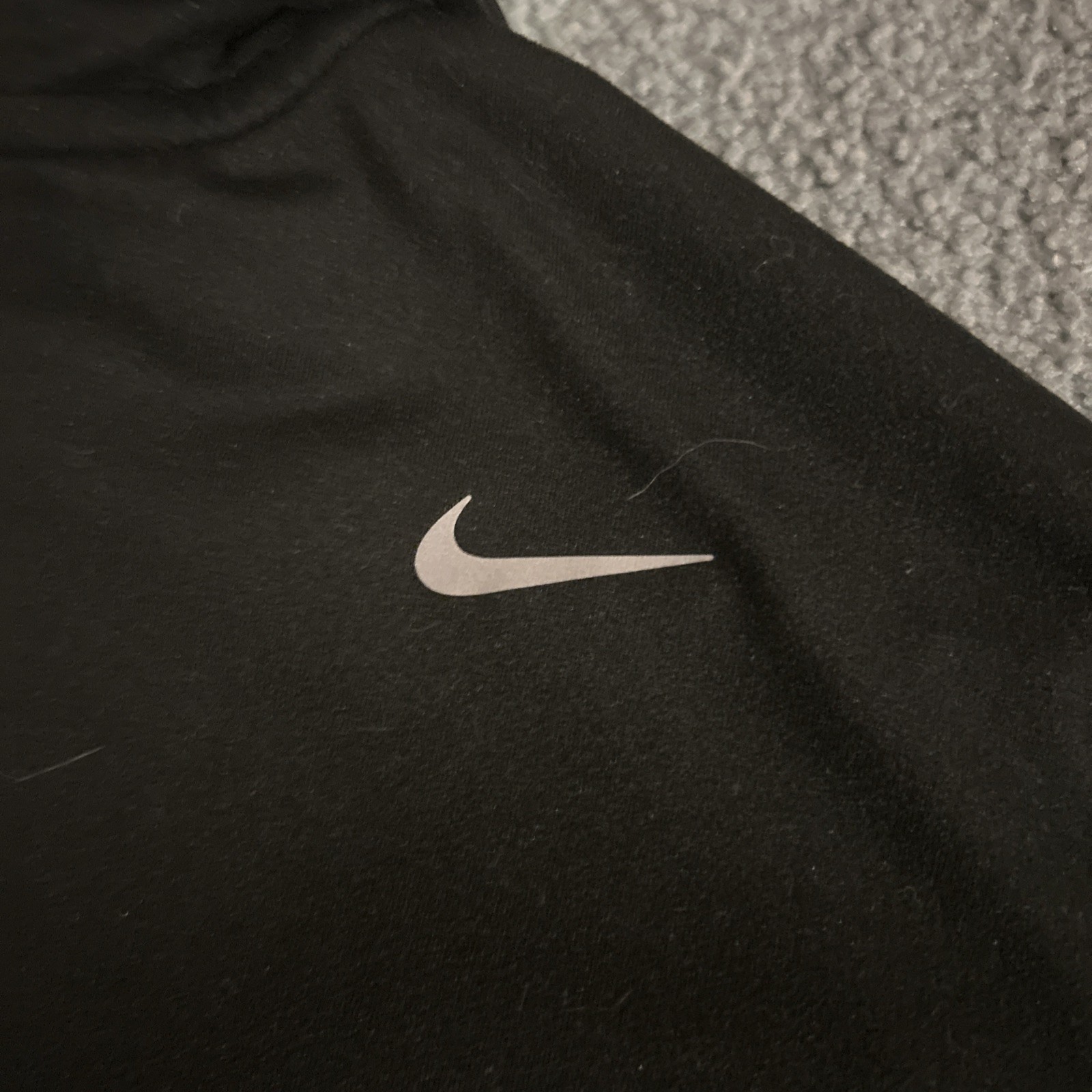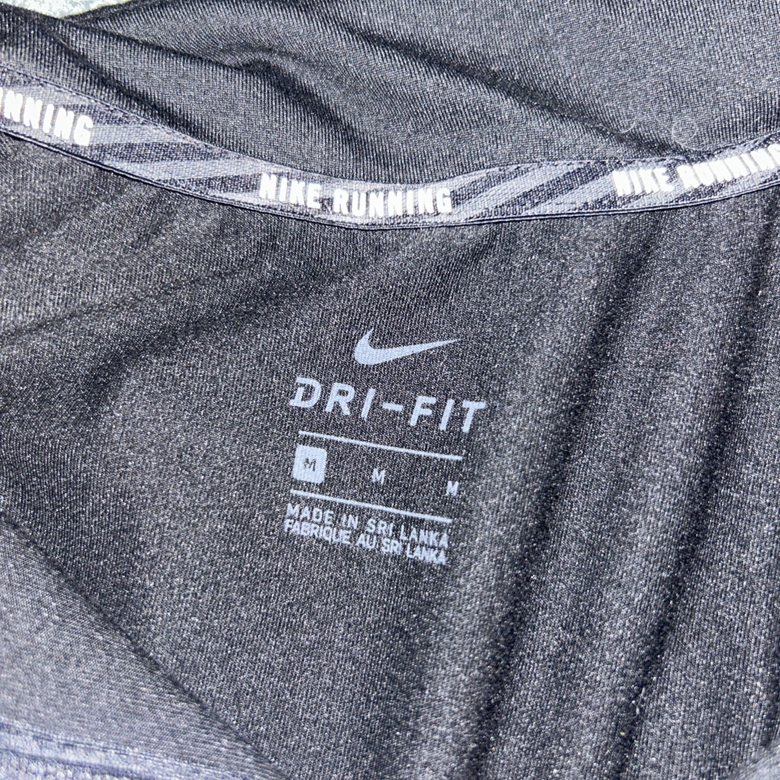Nike Dri-FIT long sleeve quarter zip running pullover top in black. Branding/details: Swoosh logo at left chest; NIKE RUNNING neck tape; tagless neck print with size M Features: Moisture-wicking Dri-FIT performance fabric; mock neck; quarter-zip front; reflective hits on sleeves and back; long sleeves; curved hem. Gender/Size: Mens M Color: Black. Country of origin: Made in Sri Lanka Notes: Lightweight athletic training/running layer designed for comfort and breathability.