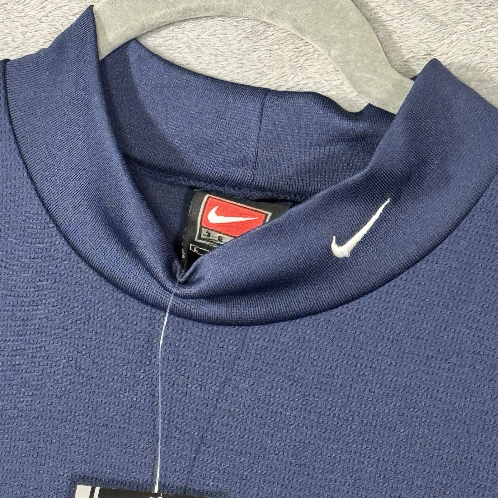 Nike Team Commander short sleeve mock neck shirt in navy. Dri-FIT performance fabric, lightweight and breathable. Men’s size Large. New with original supplier tags. Made in Korea, ©2003 Nike. Classic Y2K Nike Team training style. Measurements: Pit to pit ~22”, length ~29”.