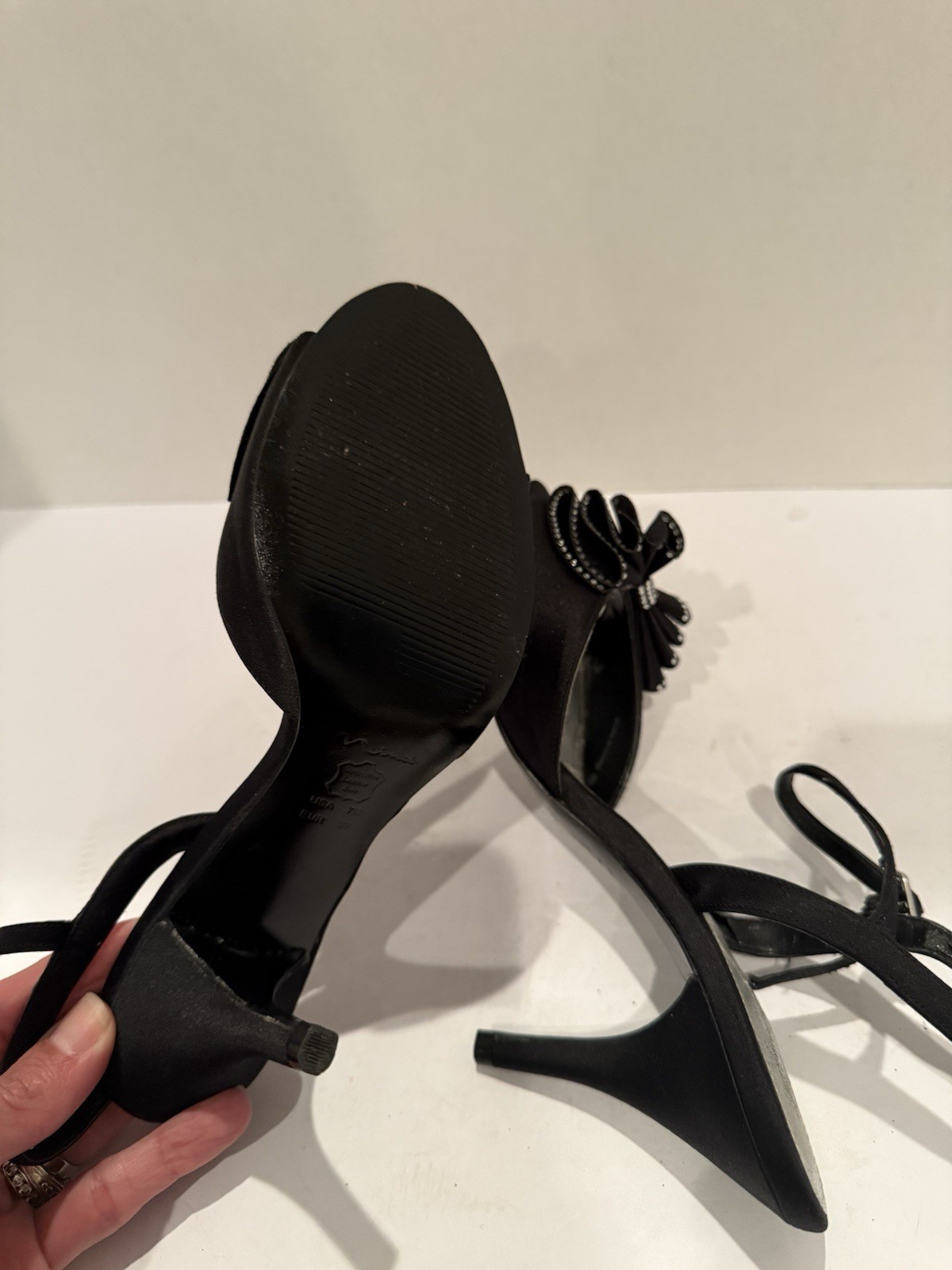 The product is a pair of elegant black strappy heels from the brand Nina, designed for special occasions. The shoes feature an open toe and a bow accent, making them stylish and feminine. Perfect for women looking to make a statement with their footwear, these heels are a chic addition to any outfit.