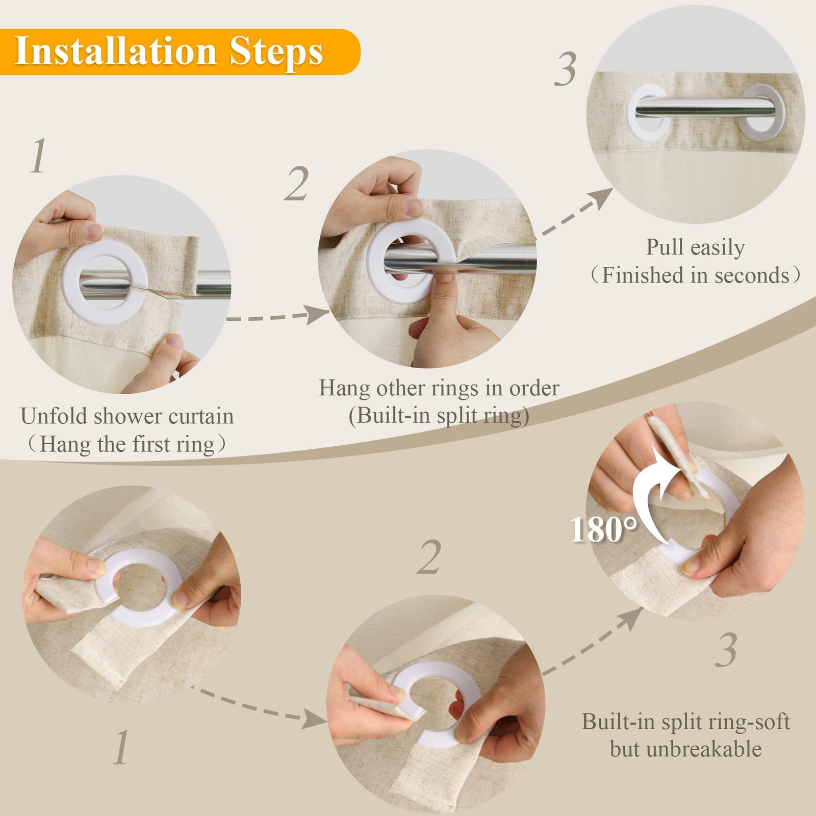 Our linen shower curtain is made of soft material with a water repellent coating on the outer and inner lining, available in a wide selection of colors and sizes such as cream, sage green, white, black, gray, tan, navy, brown, and sizes such as 75inch, 81inch, 87inch This noble linen adds a touch of elegance and sophistication to the bathroom. Create a serene and pleasant atmosphere and turn your daily bathing experience into a luxurious ! Easy Installation Without Hooks: This linen shower curtain designed with "Split Rings", Say goodbye to messy hooks and difficult installations with this no hook shower curtain. It is flex rings(not easily damaged)- making shower curtains easy to hang and remove. No additional tools required, person can do it easil Natural Linen Fabrics: Our outer linen shower curtain is made from 20% natural linen fabric and 80% polyester, which gives the linen shower curtain a soft texture, and the outer layer and lining are added with a water-repellent coating, which allows water droplets to quickly roll off the surface and dry quickly Replaceable Water Resistant Lining: Double layer fabric shower curtain with snap-on removable liner. No hook shower curtain liner prevents water from dripping out of the bathroom, keeps your bathroom dry and clean, makes feel more comfortable when taking a shower. while also making it easier to clean and replace, the shower curtains liner has metal bottom corners to prevent bottom swaying. See-through Top Window: This linen shower curtain features a unique see-through top window, allowing natural light to filter into your shower while still maintaining privacy. It adds a stylish and modern touch to any bathroom space. Easy Care: This linen shower curtain machine or hand washable to keep clean, linen shower curtain no hook fabric dries quickly. 75 inch shower curtain for bathroom fits any standard size shower/tub.