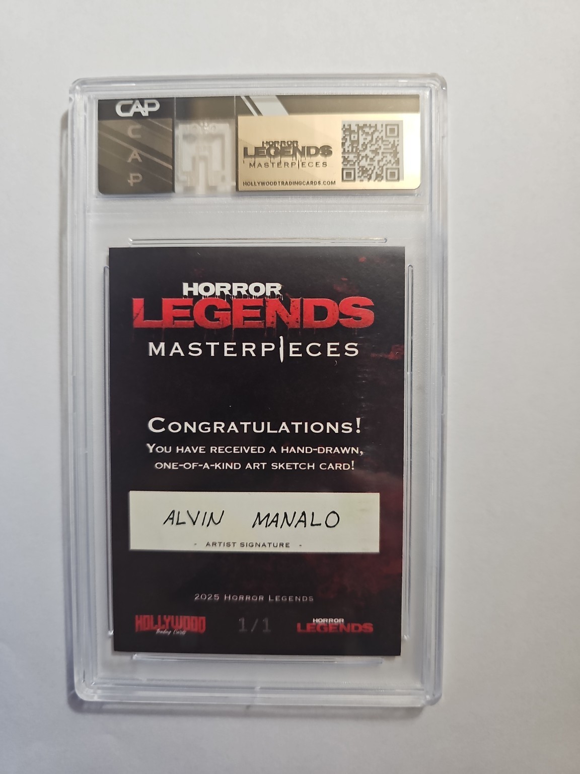 For sale is a rare, original **2025 Horror Legends Masterpieces** 1/1 sketch card featuring **Norman Bates (Psycho)**. This is a TRUE one-of-one hand-drawn artwork slabbed and authenticated by CAP / Hollywood Trading Cards. • Genuine 1/1 hand-drawn sketch • Character: Norman Bates from Alfred Hitchcock’s Psycho • Artist: Alvin Manalo • Encased and authenticated – no grading needed • Not a reprint, foil, or reproduction – this is original art