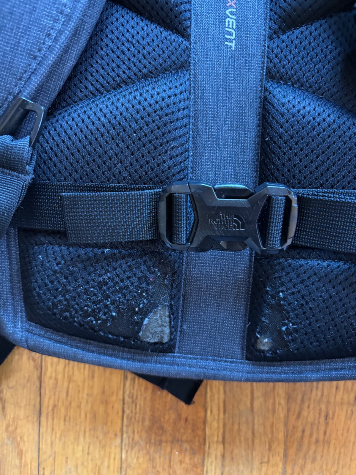 North Face Borealis backpack in good used condition. Features include padded laptop pocket, multiple internal organizing pockets, large water bottle pockets, hip strap for hiking, etc. Small wear and tear on the lower back padding and in the water bottle pockets, visible in the photos. Neither affects functionality.