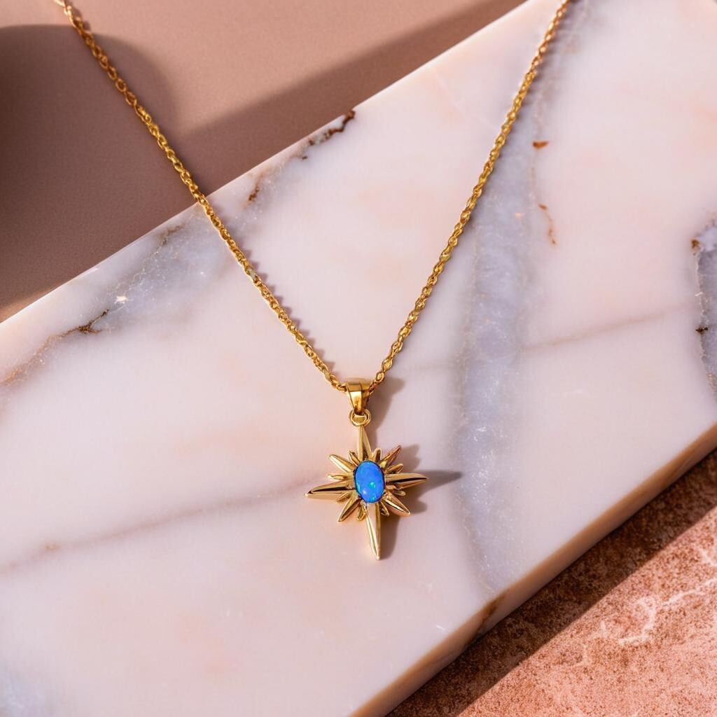 Add celestial charm to your style with our stunning North Star Blue Opal Pendant Necklace. Crafted with care and elegance, this dazzling starburst pendant features a captivating synthetic blue opal-like gemstone that shimmers beautifully in the light. Suspended from a 45+5cm adjustable gold-tone cable chain, it’s perfect for layering or wearing solo. ✨ Features: Pendant Size: 22mm (Length) x 17mm (Width) Chain Type: Gold tone Cable Chain, adjustable from 45cm to 50cm Design: Starburst/North Star motif with oval blue opal-like centre stone Style: Modern, minimalist and celestial – perfect for both day and evening wear Closure: Lobster clasp for secure and easy fastening Ideal For: Gifting, everyday wear, celestial jewellery lovers, birthdays, anniversaries 🎁 Why You’ll Love It: Eye-catching North Star design symbolising guidance and protection The synthetic opal centre catches the light with magical iridescence Comfortable, lightweight, and elegant enough for all occasions Makes a thoughtful gift for someone special – or a treat for yourself! 💝 Ships from the UK with care – Ready to wear or gift!