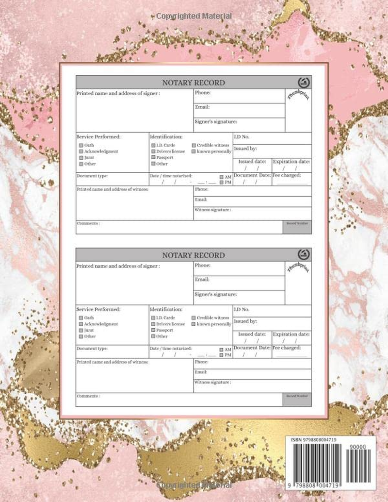 Notary Records Journal Size 8½” X 11”. 110 pages. 2 records per page. Template pages to write down details for 210 records. 5 pages of ruled lines are also included to jot down your notes. Consecutively numbered pages. Soft-touch paperback matte cover that repels moisture. Each entry includes: Record Number Name Address Phone Number Email Service Performed Identification Type Identification Number / Issuer / Issue & Expiration Date Document Date and Type Date and Time Notarized Fees Witness Name / Address / Phone / Email Witness' Signature Signer's Signature thumbprint Comments box for additional information * The best journal created for signings and general notary work. * Easy to use, time saver, thorough.