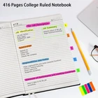 Notebook Journal, " x 11", 400 Pages College Ruled Notebook, Leather Journal for Women Men, Thick Journals for Writing, 125pcs Sticky Tabs, Inner Pocket, A4 Large Notebooks for Work School, Black 400 Pages Last All : The plenty of pages are perfect for daily journal, day planner, notes, diary, sketches, sticking photos. Each page has a blank header with Memo No., Date, a place to circle the day of the week and the weather, which is quick and easy referencing of your note. High Quality Thick Paper: Acid free paper made ensures superior smooth writing. Each page is 100 gsm weight for fountain pens, ballpoint pens, highlighters to write on both sides of each sheet without bleeding through, smearing or ghosting to protect your handwriting. Leather Notebook: Premium vegan leather offers a flexible and durable cover to take more comfortably and write more easily than hardcover notebook. Sturdy thread bound helps lay flat to write on both front and back pages very well for right and left-handed users. Letter Size Large Notebook: Inserted 2 ribbon bookmarks to take you back to the exact pages you want quickly. Free 125 assort colors index tabs to highlight key items, page markers, dividers into many sections. Solid expandable back pocket for loose leaf paper, receipts. Notebooks College Ruled: lined notebook journal for women and men. Large and lots of pages to track multiple tasks in one notebook, builted-in bookmarks and index stickers for organization. Perfect gift for journaling lovers, students, colleagues, writers and anyone. Large Vegan Leather Journal Notebook Premium Cover Made from vegetable tanned leather, which is a tanning method that uses natural tannins derived from plants. This process works on thicker leather and creates a material with rich beautiful color and a softer surface with an interesting grain.Offering a durable and waterproof protect for your writing.Softcover makes it slide comfortably into a bag or backpack.Exquisite office gift or school gift for yourself, families, friends, work colleagues, school classmates, students, working professionals, journalers, and more. Durable Construction A combination of thread and glue allows for a more tightly bound notebook that can also 180° lay flat to help read and write easily for both right and left-handed users. This type of binding is great for you who prefer a sleek notebook with a sturdier binding.Archival quality, with sturdy binding and acid-free paper to keep and reread for decades.