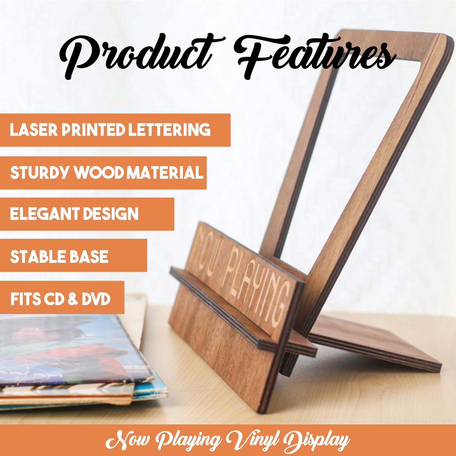 Vinyls sound impressive and often look beautiful, an album stand for vinyl records can display the artwork on the covers of your music collection. Our record now playing stand is one of the perfect vinyl records accessories for music lovers and vinyl enthusiasts. This vinyl holder stand is crafted to showcase your records and add a style touch to your turntable accessories corner. With its sleek and compact design, this vinyl records display is ideal for any shelf or tabletop. Its wood-brown color adds a rustic charm that complements any interior setting. Our record stand display is crafted from high-quality wood and comes in a timeless brown shade. It is handcrafted to last and adds a touch of elegance to any music enthusiast's arrangement. Enhancing your listening experience is easy with proper vinyl record accessories, whether you're a seasoned collector or just starting. The now playing sign display stand offers easy access to your favorite albums while keeping them organized and tidy. It's the perfect practical gift for any vinyl enthusiast who wants to showcase their collection. Stylish Retro Vinyl Display Stand - Enhance your turntable corner with the classical appeal of our vinyl stand display. Showcase your favorite records and transform your space into a true vinyl enthusiast's haven. Store Up to 5 Vinyl Records - Conveniently stores your cherished albums for easy access and maintains neat organization. Our now playing record stand can also hold CDs alongside your music collection. Hassle-Free Assembly - Setting up this now playing record holder requires only four steps. No tools or complicated instructions are needed—experience effortless setup with our vinyl record display stand. Built To Last - Vinyl now playing stand is made from high-quality wood in a classic brown color. It is strongly built to withstand the test of time—a durable and chic addition to any music lover's setup. LP Vinyl Record Storage Display Stand for Turntable Lovers - Perfect and practical gift for vinyl enthusiasts. Their favorite now spinning record deserves to be displayed on a stylish wooden record stand.