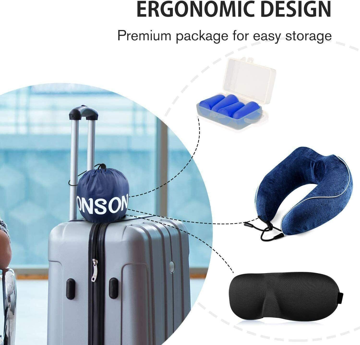 ONSON Travel Pillow 100% Pure Memory Foam Neck Pillow Includes Ear Plugs, Mask & Bag - Retails for $39 Free Shipping It’s time to add extra comfort to your travel, business trip, office rest. You deserve higher quality rest! Neck Pillow Made with 100% pure memory foam, high quality memory foam According to the streamlined design of the back neck of the human body Enjoy maximum support due to its slow-rebound memory foam material Prevent neck pain and eliminate discomfort during your trips U-shape & Back-flat Cut - The neck pillow is designed in U shape with a flat cut at back which helps better support our neck and hold our head, prevents it from pushing forward or leaning on seat neighbor when sleeping Premium Memory Foam - The travel air pillow is made from high quality breathable and comfortable memory foam, uses the 5 seconds return technology, cushions the body and relieves painful pressure points for ultimate relaxation Adjustable Buckle Drawstring - We add an adjustable buckle on the memory foam travel pillow to fit different size needs and give extra support to keep the pillow in place. A comfortable pillow for whole family Package Included - Memory Foam Travel Pillow x 1 3D Sleep Mask x 1, Earplugs x 1, Reusable Bag x 1