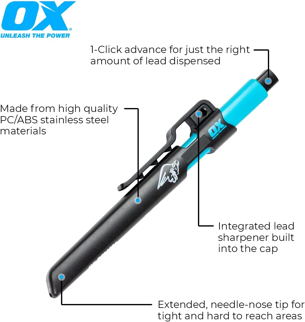 Quality - Constructed from the highest quality pp/abs/stainless steel materials to ensure long life withstanding all jobsite conditions. Ease of Use - Extended, needle-nose tip for tight and hard to reach areas. Accuracy - 1-Click advance for just the right amount of lead dispensed. Refillable - Stainless steel lead feed tube for easy refilling and continued use - diameter of lead 2.8mm. Works with all OX Tuff Carbon marking range leads. Sharpener Built In - Integrated lead sharpener built into the cap of the holder to ensure ease of use and precise marks. Accepts 2.8mm replacement leads Product Description Since 1974 we have been delivering high quality professional tools to the general construction, masonry and tiling trades. Our company has grown steadily based on the quality of our products and our determined pursuit of service excellence. Hand Tools Diamond Tools Tool Storage Safety Tools Workwear Tools OX Tools Pro Tuff Carbon Marking Pencil With 4 Leads & Pencil Holder & Sharpener Belt Clip OX-P503210 The OX Tools Precision Mechanical Carpenter's Pencil Holder is built with durable PP, ABS, and stainless steel for tough job site use. Its extended needle-nose tip reaches tight areas, while the 1-click advance ensures precise lead dispensing. The stainless steel lead feed tube is easy to refill with 2.8mm leads, compatible with OX Tuff Carbon marking leads. An integrated sharpener in the cap ensures clean, accurate marks every time, making this tool essential for precise carpentry work. Constructed from the highest quality pp/abs/stainless steel materials to ensure long life withstanding all jobsite conditions. Extended, needle-nose tip for tight and hard to reach areas. 1-Click advance for just the right amount of lead dispensed. Stainless steel lead feed tube for easy refilling and continued use - diameter of lead 2.8mm. Works with all OX Tuff Carbon marking range leads. Integrated lead sharpener built into the cap of the holder to ensure ease of use and precise marks. Built Tough with Stainless Steel Durability Crafted from premium PP, ABS, and stainless steel, this tool is built for long-lasting durability, designed to withstand the toughest job site conditions. Multi-colored wax lead Featuring multi-colored 2.8mm wax leads in graphite, yellow, red, and white, this marking tool ensures clear, easy-to-read marks on any surface. Perfect for versatile job site applications. Built In Sharpener Designed for convenience, this tool features an integrated lead sharpener built into the cap, allowing for quick sharpening and precise marks every time. Square Design Prevents Rolling The square design of this tool prevents rolling, ensuring stability and easy access during use. Perfect for keeping your workspace organized and efficient.